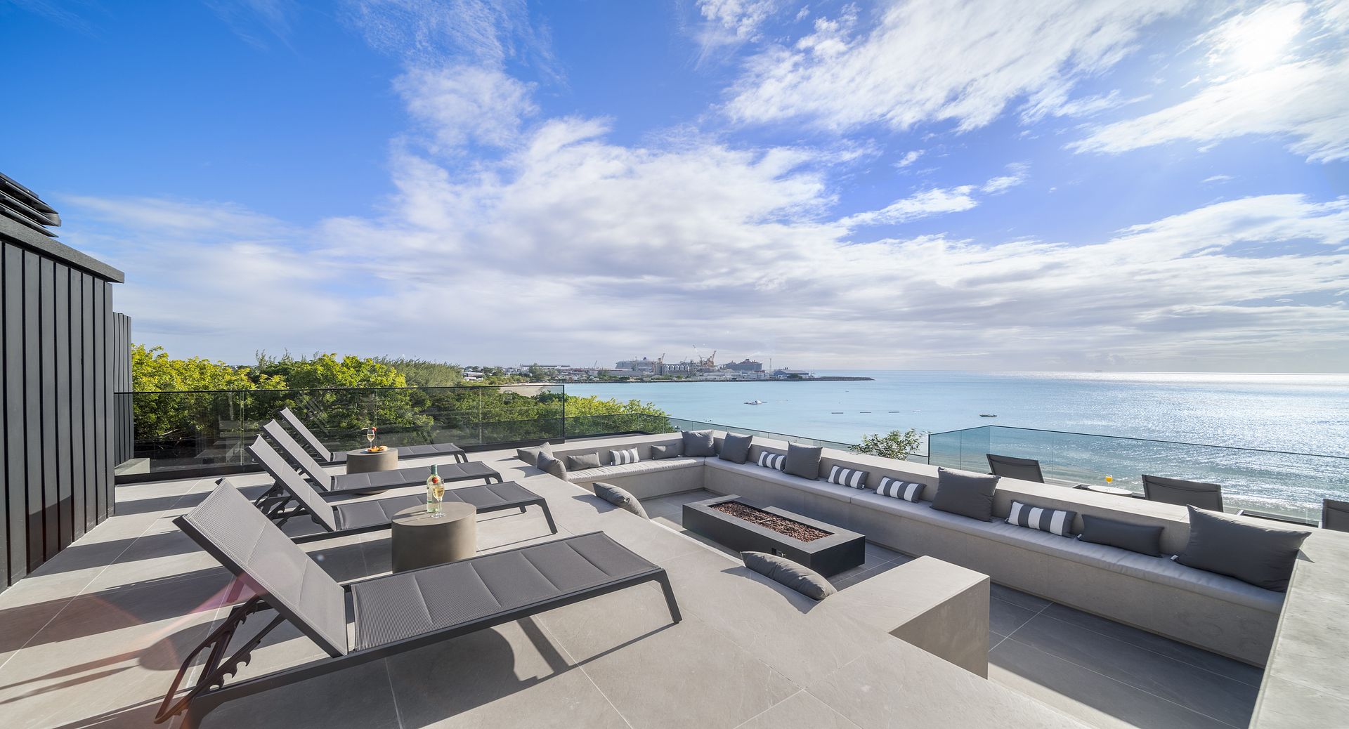 Step inside the open-plan living area, where sleek, contemporary furnishings complement stunning panoramic sea views. The spacious layout is designed for both comfort and style, with bespoke décor and smart home technology that makes for an effortless living experience. The fully equipped kitchen features premium appliances and a breakfast bar, perfect for preparing island-inspired meals. A convenient powder room adds to the home’s practicality.