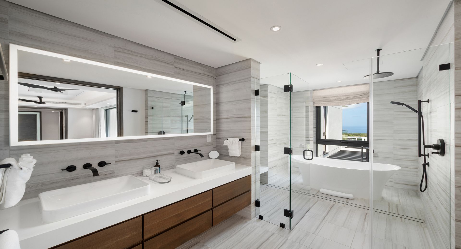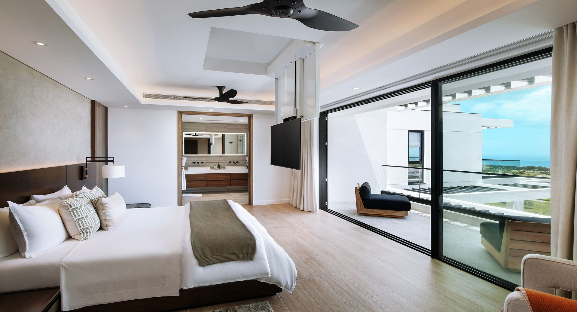 The interiors are calm, elegant, and effortlessly refined. All four bedrooms in the main house are located on the upper level, creating a private retreat away from the living areas. Three sea-facing suites feature king-size beds, en-suite bathrooms, and private terraces with elevated views across the golf course and out to the Caribbean Sea. The fourth bedroom also offers a king bed, with its bathroom conveniently located just outside. Each room is designed as a serene sanctuary, blending comfort, privacy, and understated luxury.