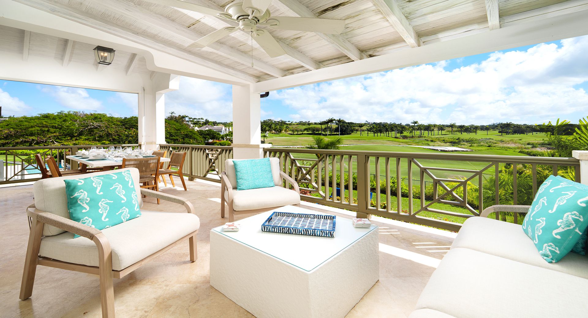 The open plan living and dining area can be found on the upper level of this luxury Barbados villa, leading out to a spacious covered balcony where guests can relax and enjoy amazing views over the putting greens and coastline. The modern kitchen is well-equipped, with everything at your fingertips to make your holiday in Barbados relaxed and enjoyable.
