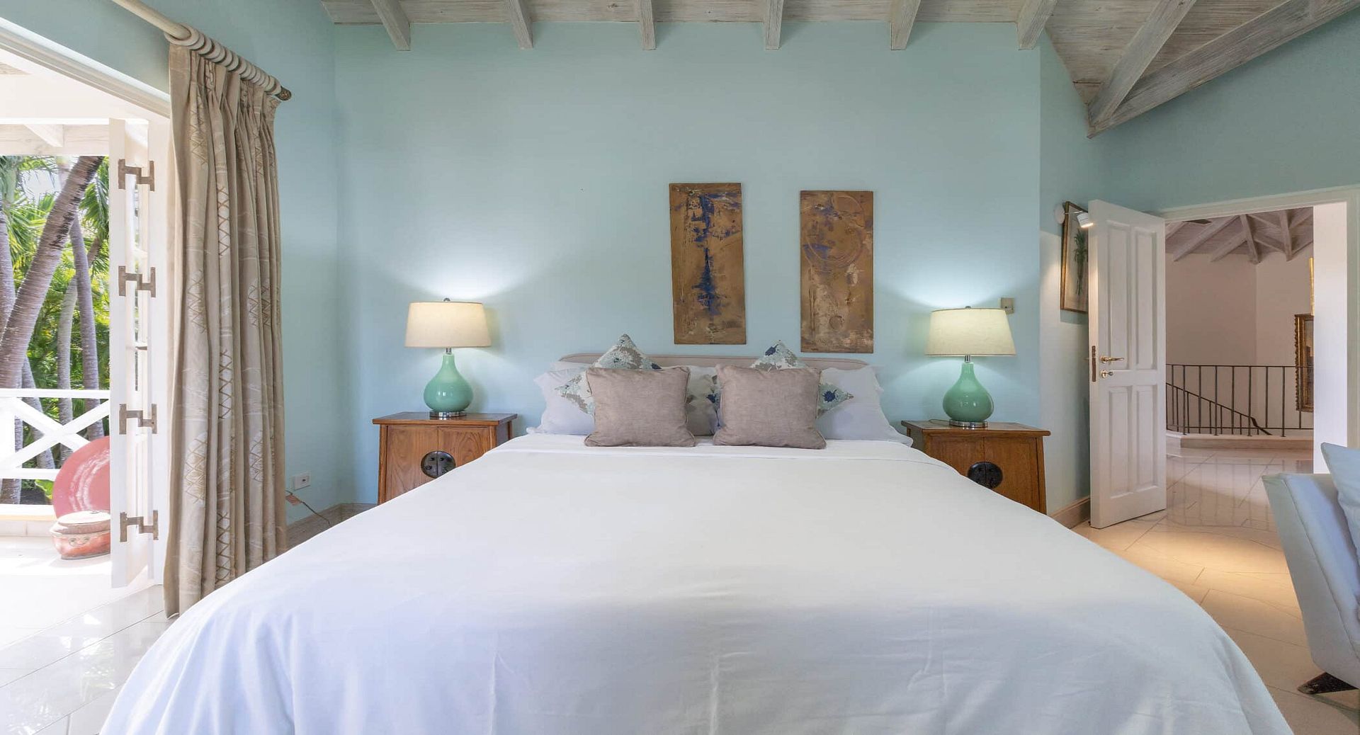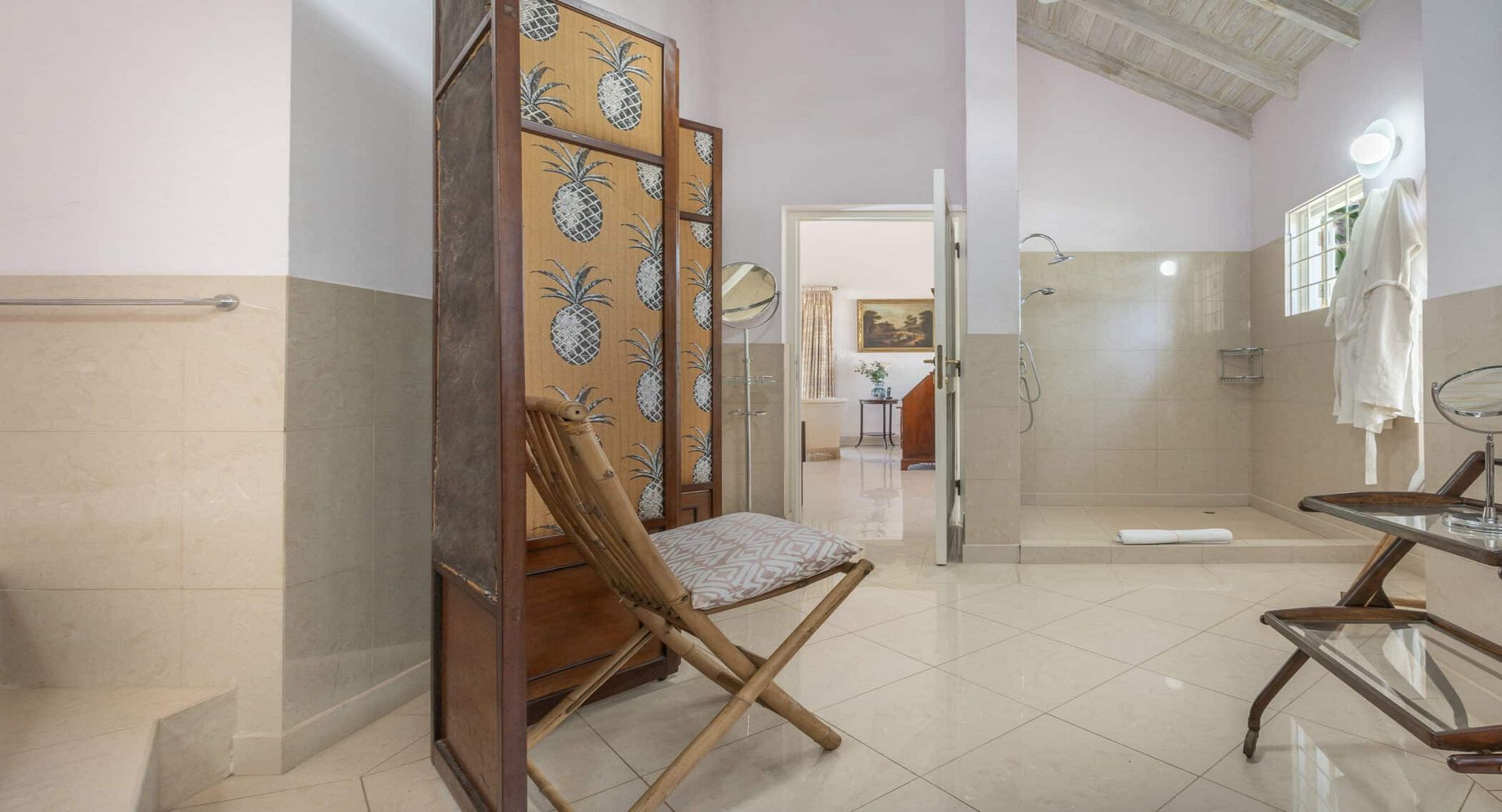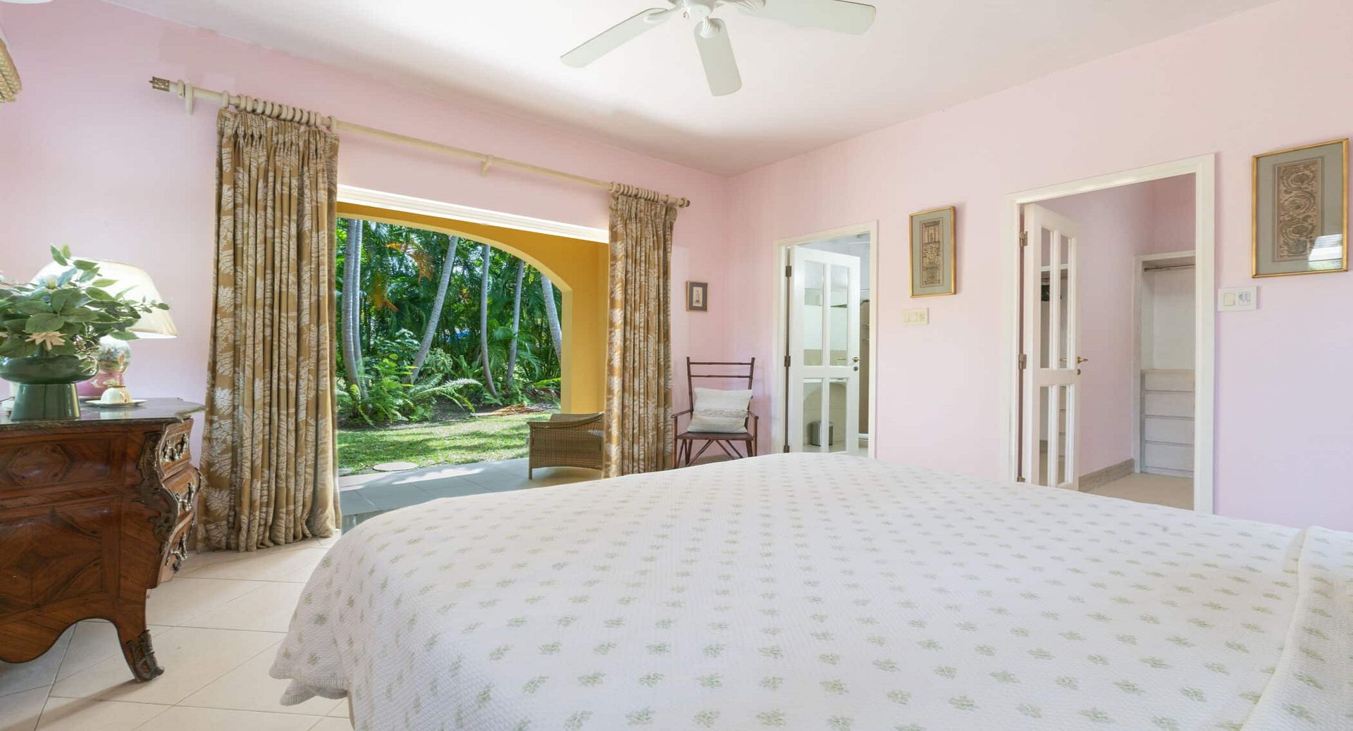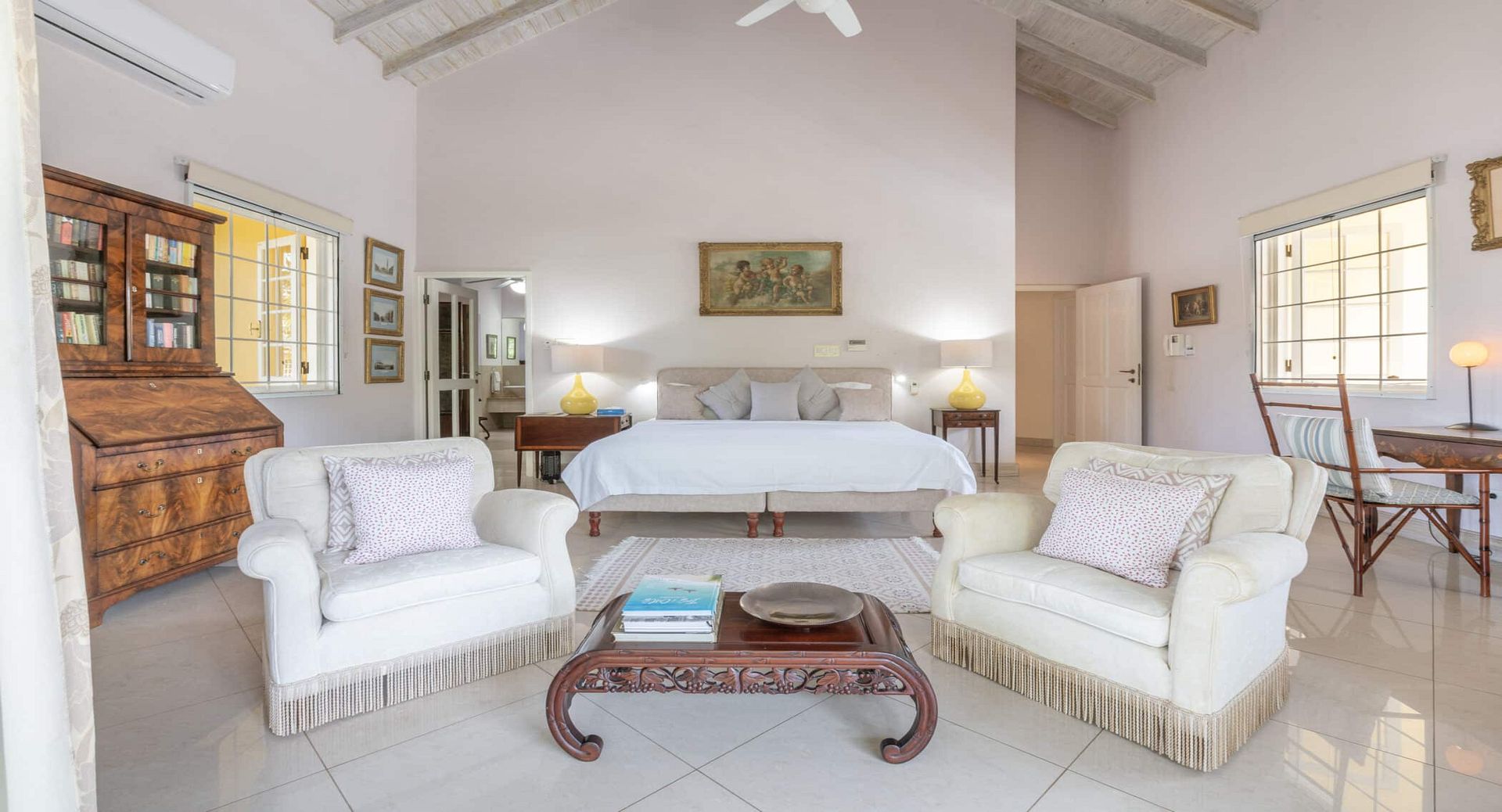 The seven spacious bedrooms, each with its own en-suite bathroom, are thoughtfully arranged across the main villa and a separate two-bedroom guest cottage, offering privacy and flexibility for larger groups or multi-generational families. Two impressive master suites feature private terraces, while other bedrooms open directly onto the pool terrace, patio, or tranquil garden spaces. Bedrooms are beautifully configured with king, queen, and convertible twin beds to suit a variety of guest arrangements.