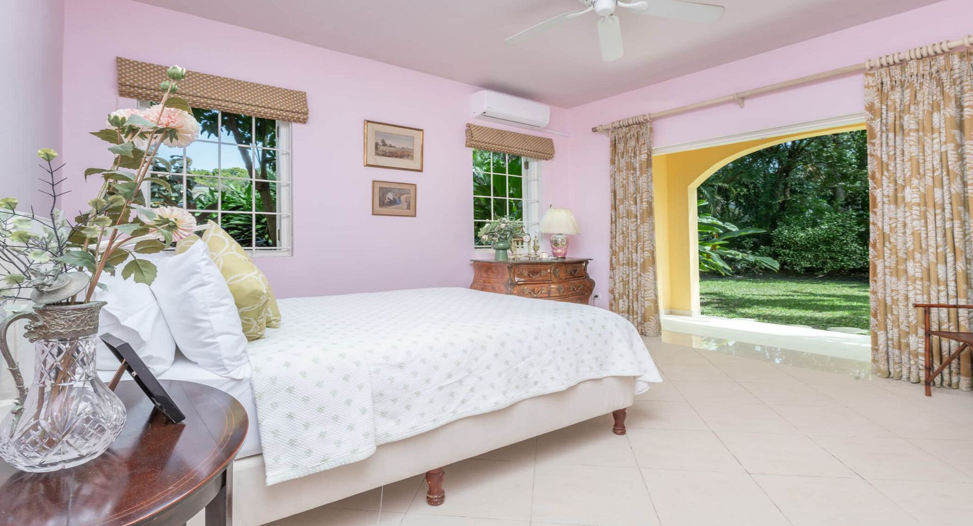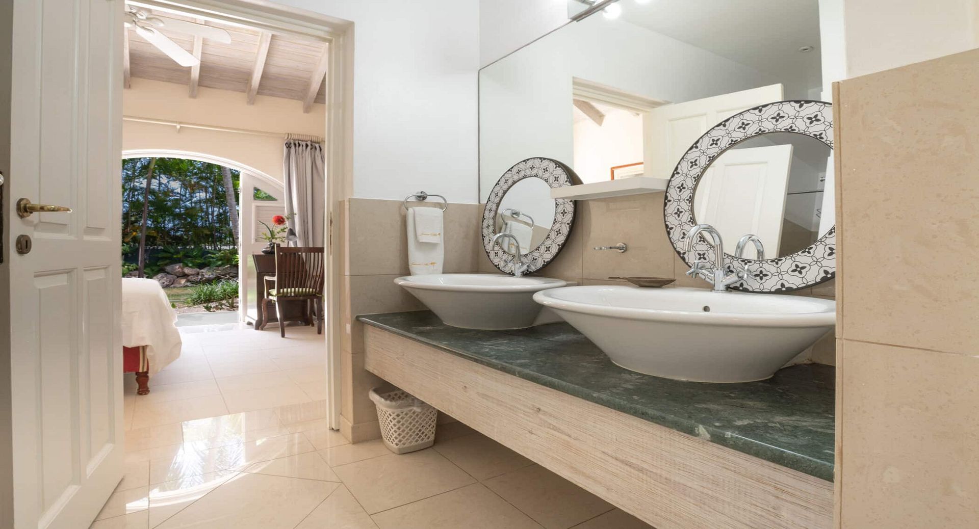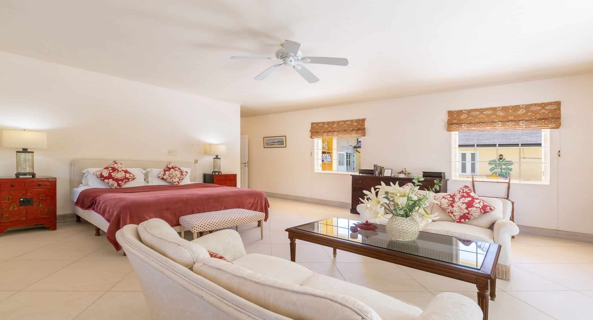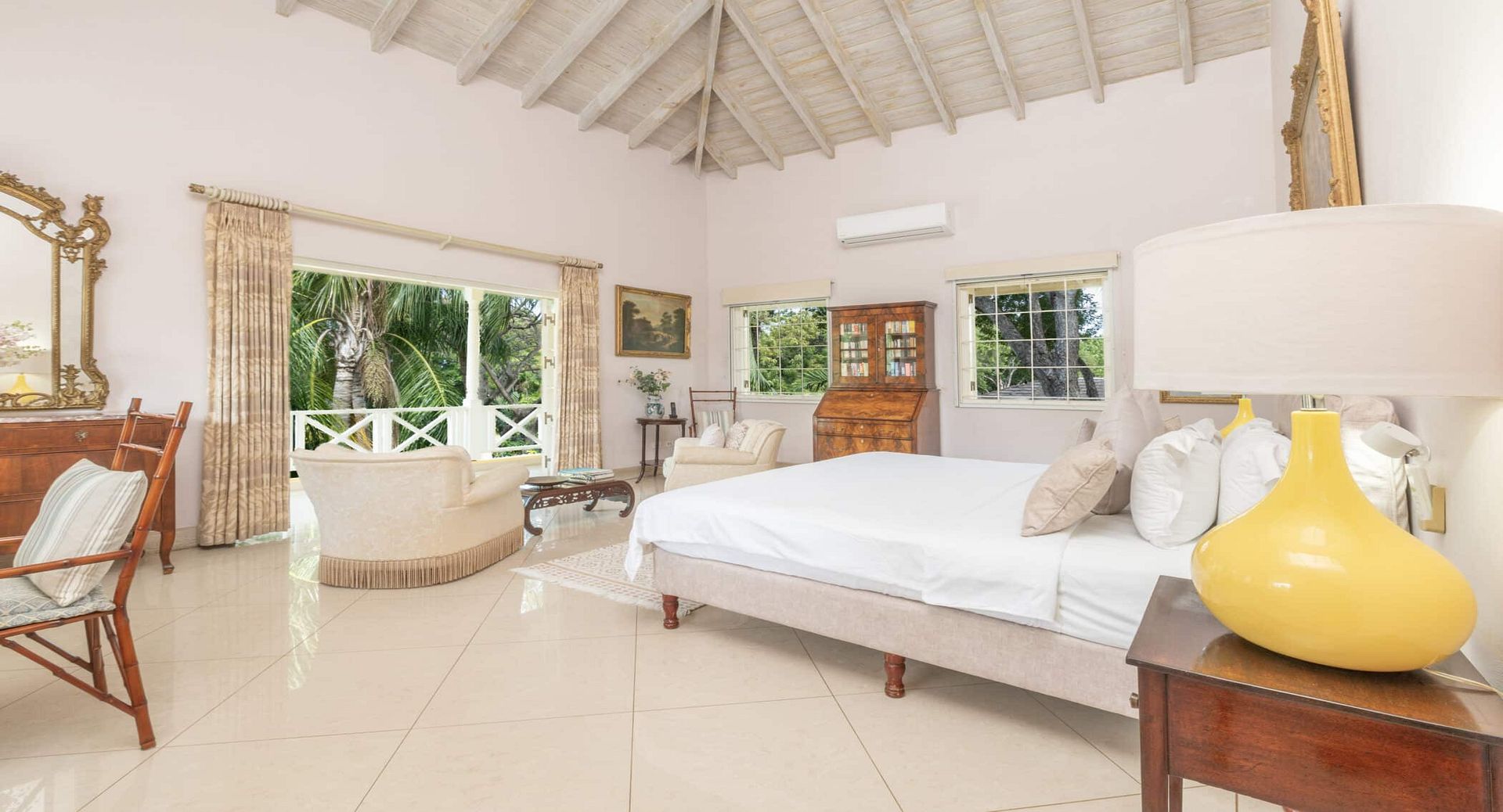 The seven spacious bedrooms, each with its own en-suite bathroom, are thoughtfully arranged across the main villa and a separate two-bedroom guest cottage, offering privacy and flexibility for larger groups or multi-generational families. Two impressive master suites feature private terraces, while other bedrooms open directly onto the pool terrace, patio, or tranquil garden spaces. Bedrooms are beautifully configured with king, queen, and convertible twin beds to suit a variety of guest arrangements.