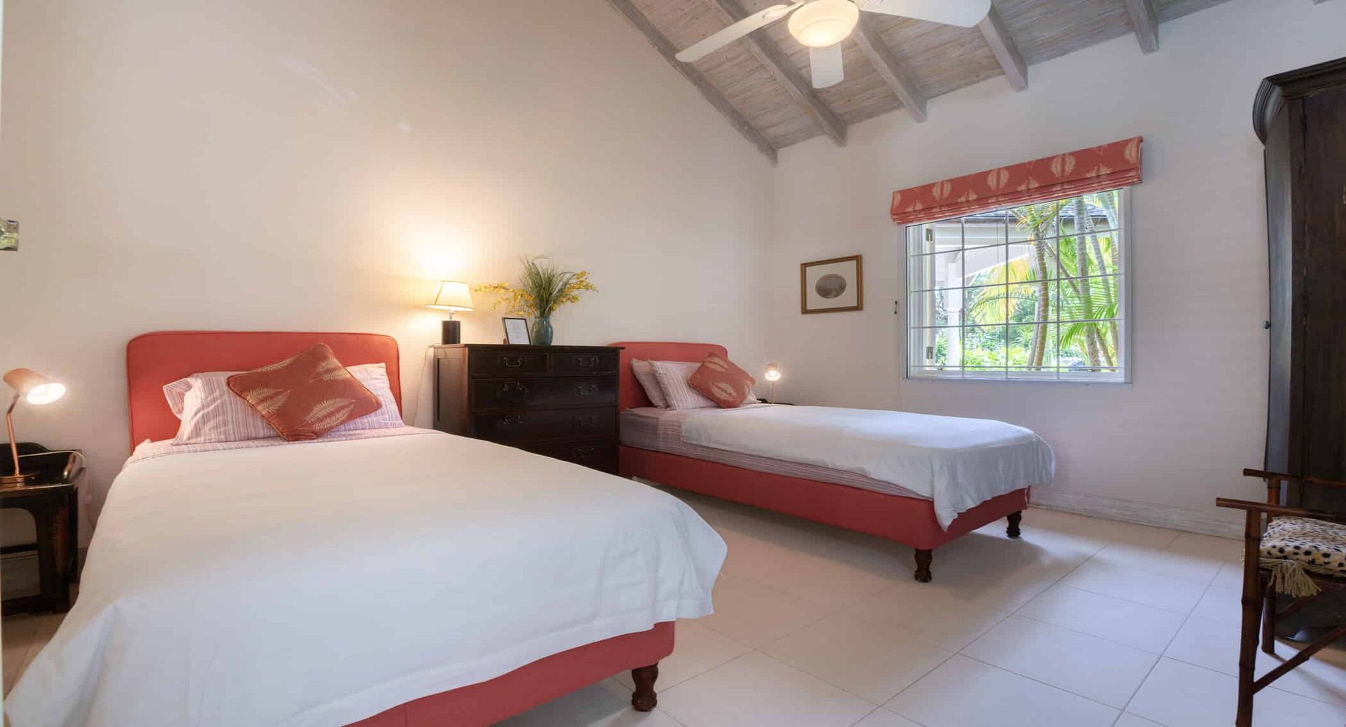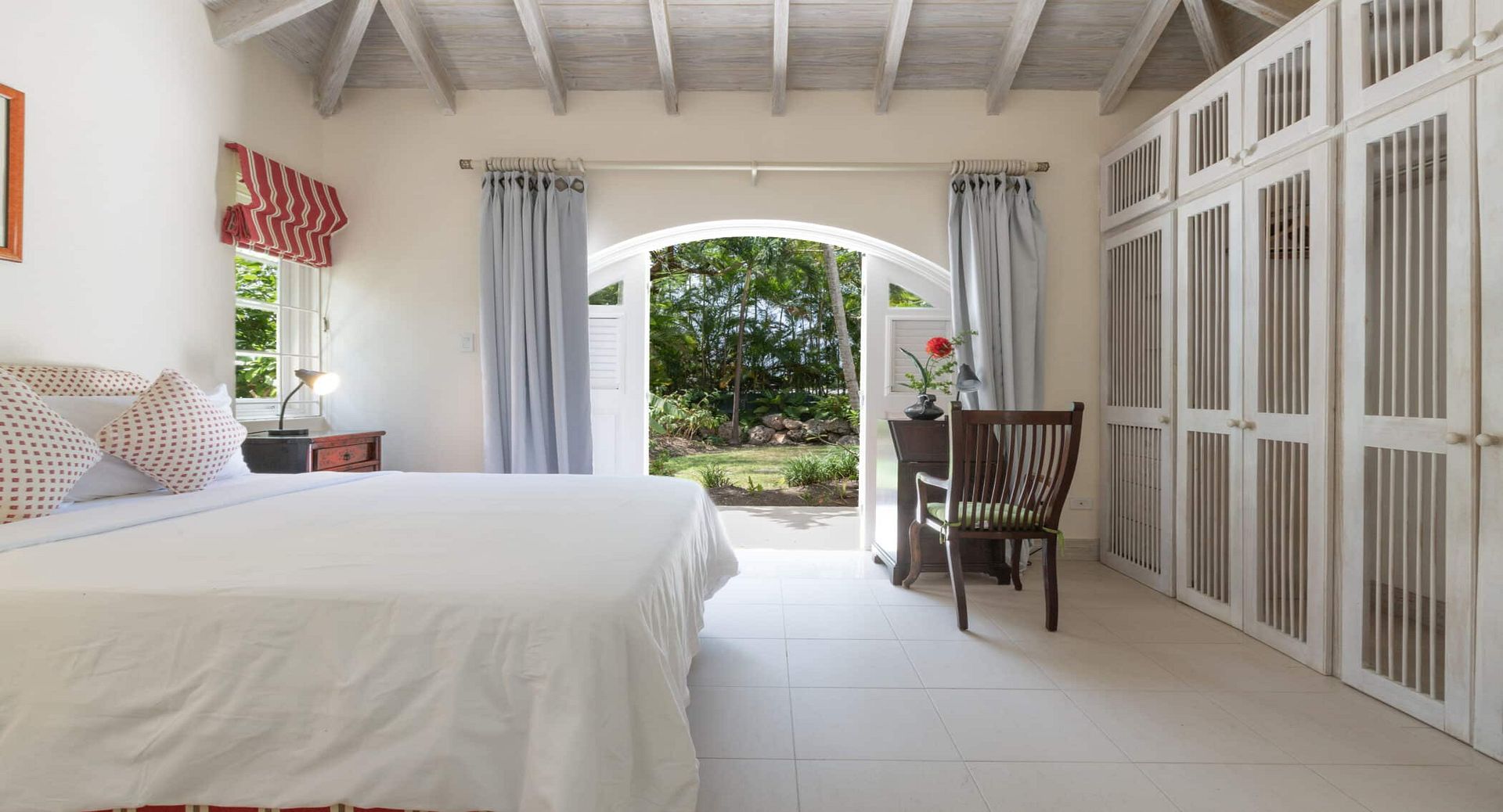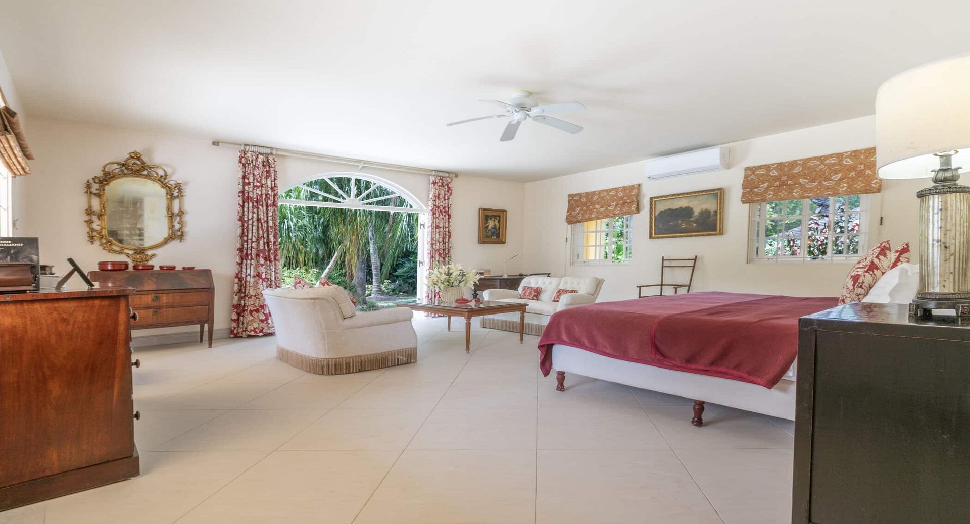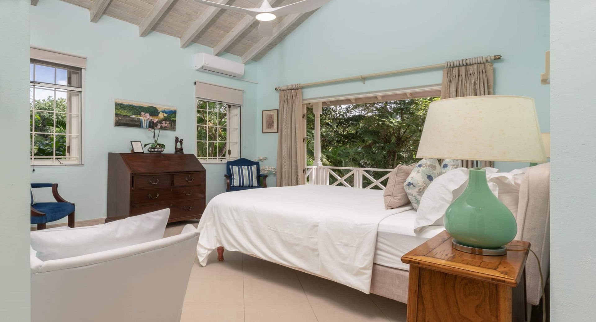 The seven spacious bedrooms, each with its own en-suite bathroom, are thoughtfully arranged across the main villa and a separate two-bedroom guest cottage, offering privacy and flexibility for larger groups or multi-generational families. Two impressive master suites feature private terraces, while other bedrooms open directly onto the pool terrace, patio, or tranquil garden spaces. Bedrooms are beautifully configured with king, queen, and convertible twin beds to suit a variety of guest arrangements.
