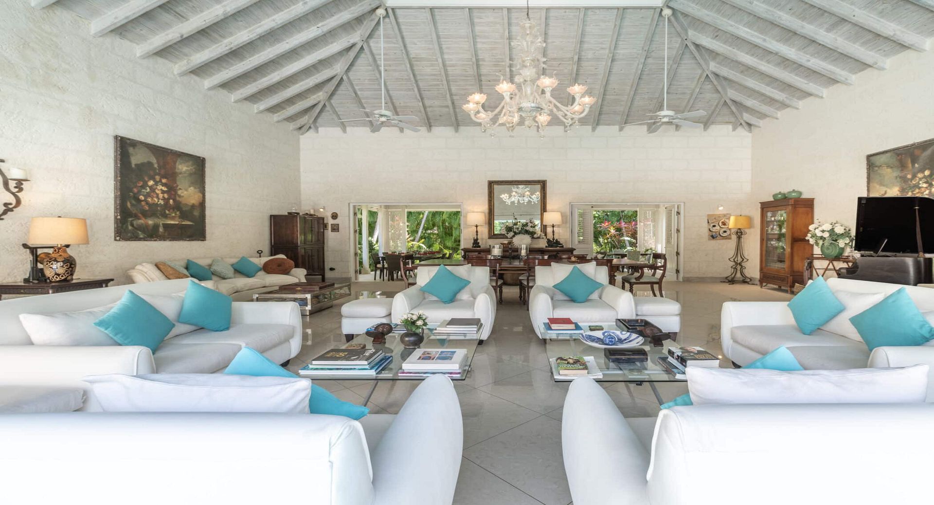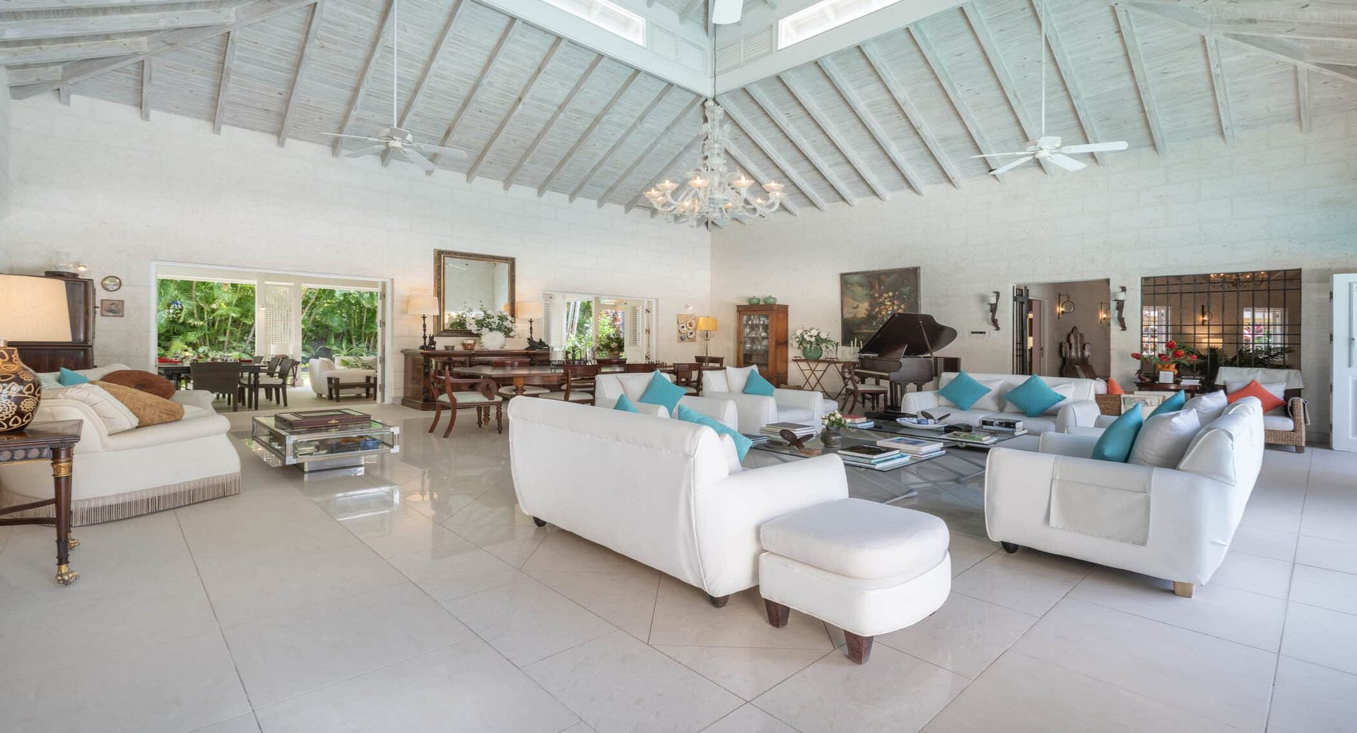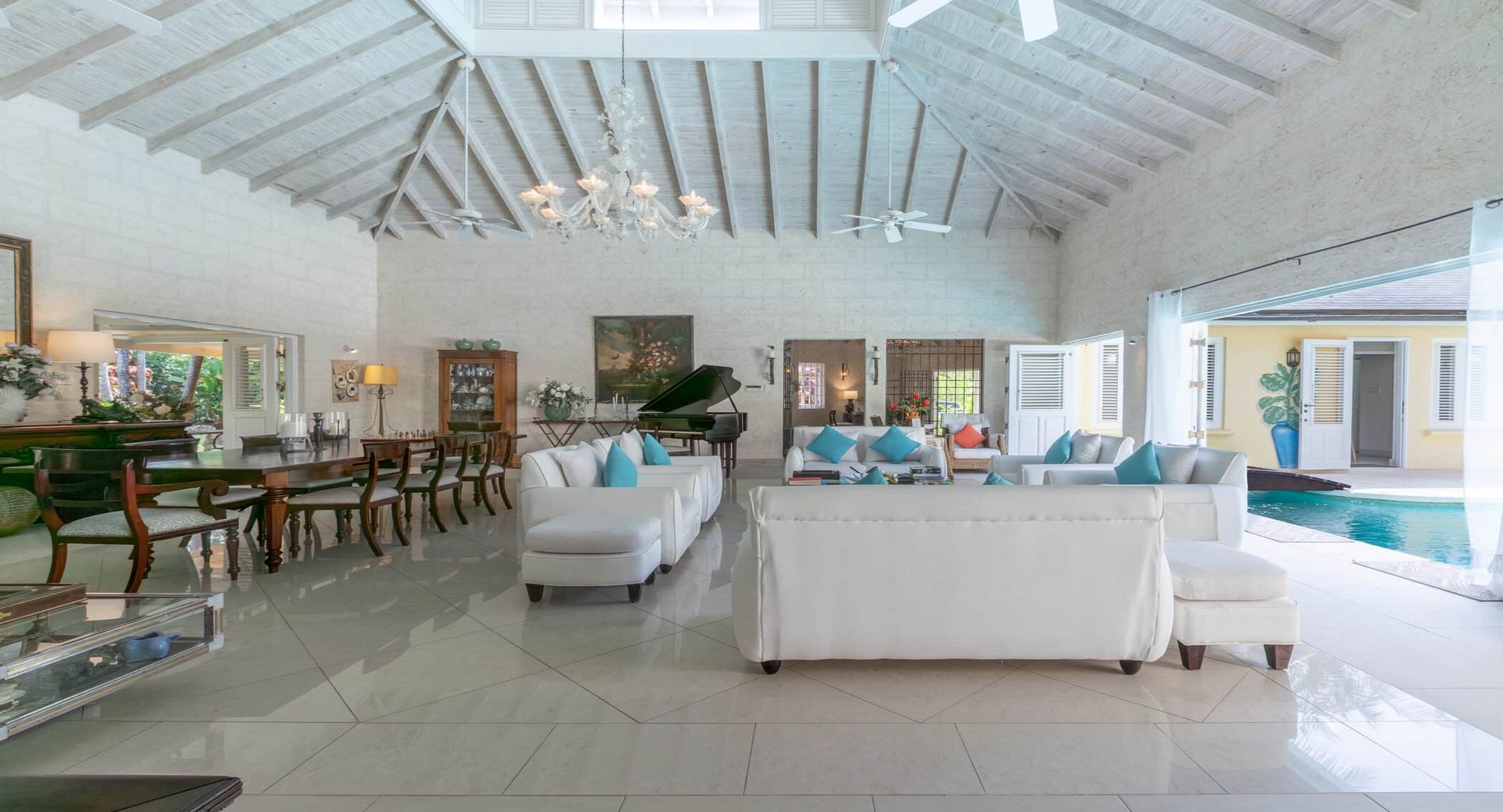 Outdoors, the villa’s private swimming pool is surrounded by sun loungers, landscaped gardens, and shaded seating areas, creating a peaceful retreat where guests can relax throughout the day. A sun deck, BBQ area, and outdoor lounge spaces invite long afternoons under the Caribbean sun, while the nearby beach and golf courses provide endless opportunities for exploration.