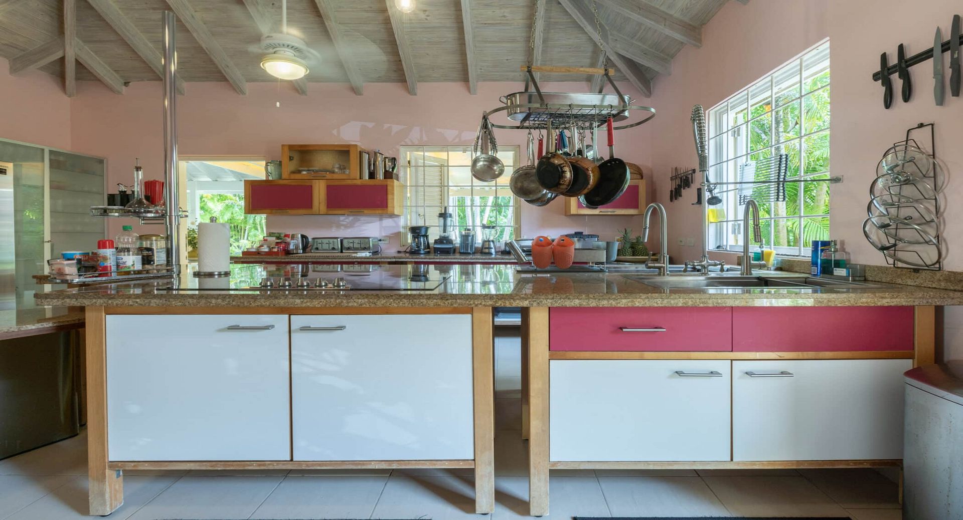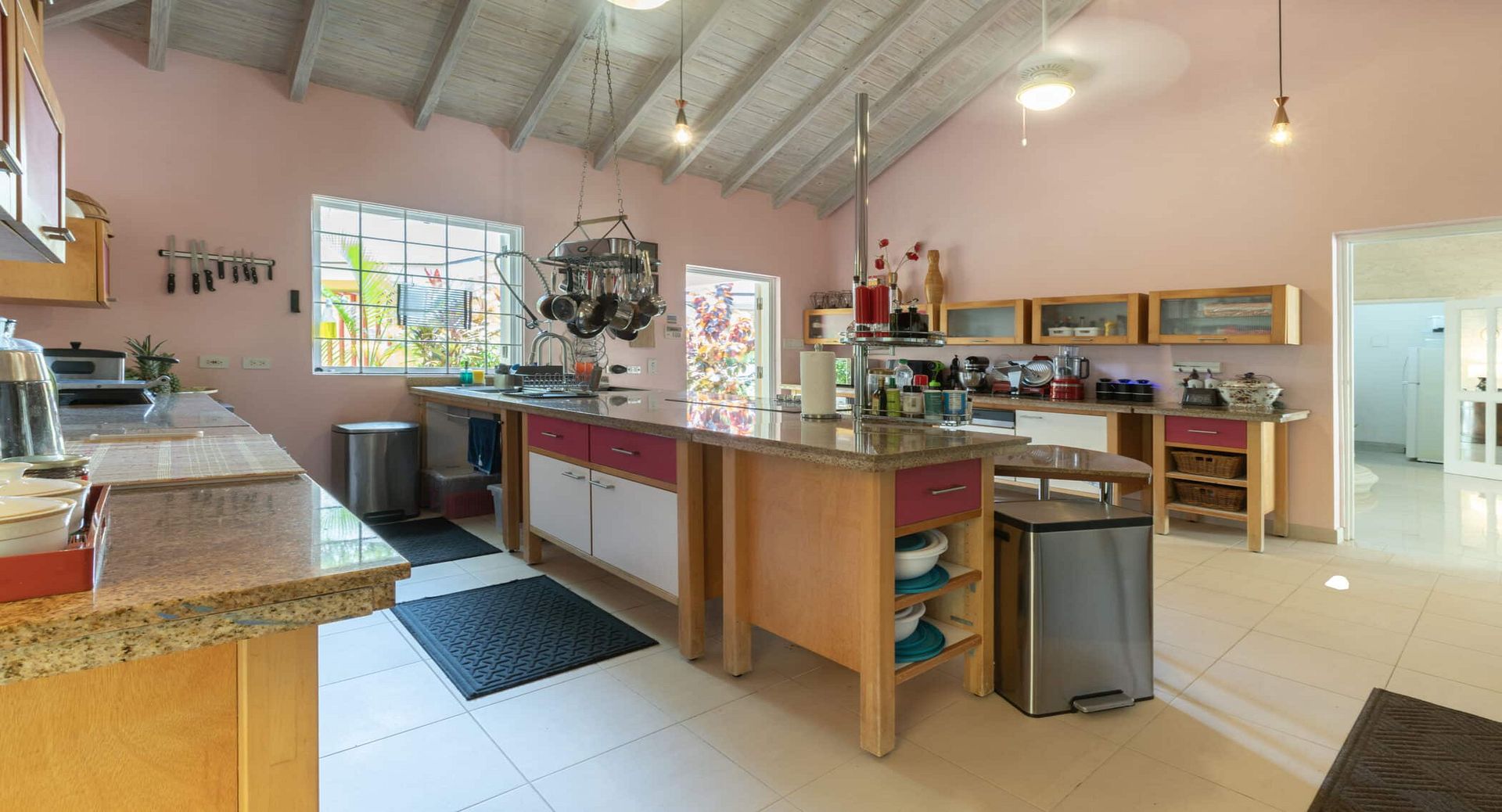 At the heart of the home lies a large gourmet kitchen, equipped with high-end appliances, a breakfast bar, wine fridge, and every modern convenience. While guests are welcome to use the kitchen, the villa is also fully staffed, with a private chef, housekeeper, and laundress ensuring every detail of your stay is effortlessly taken care of.