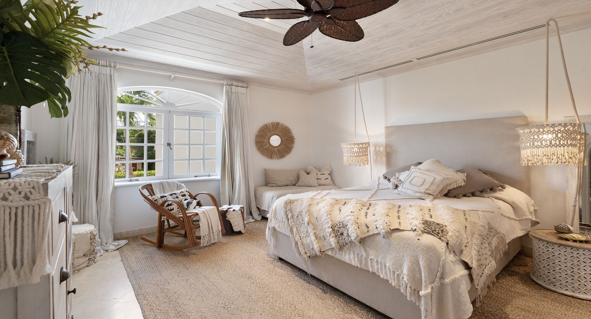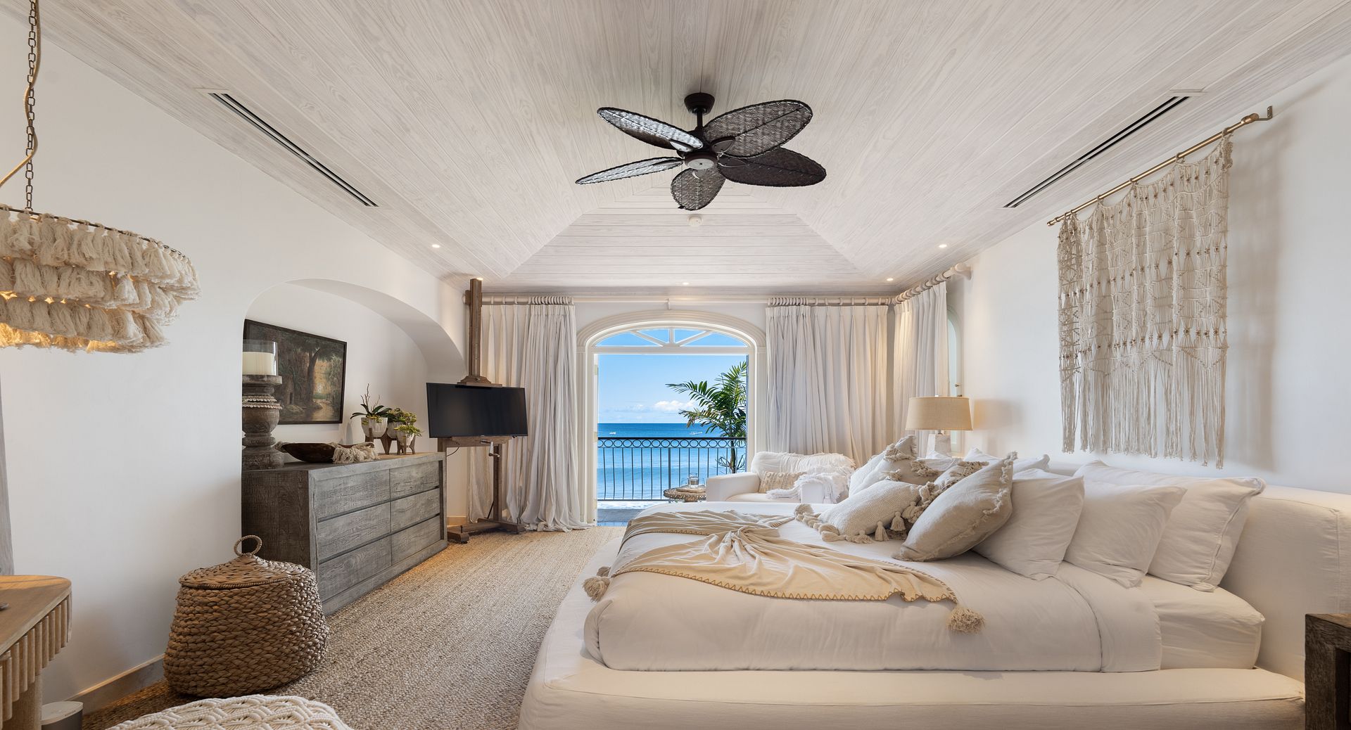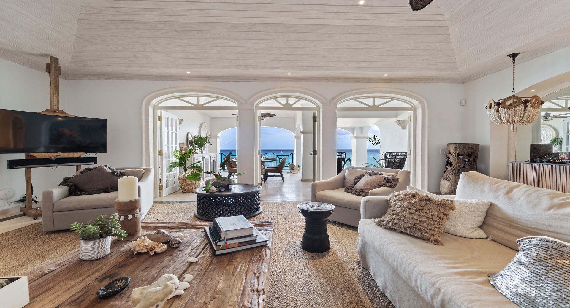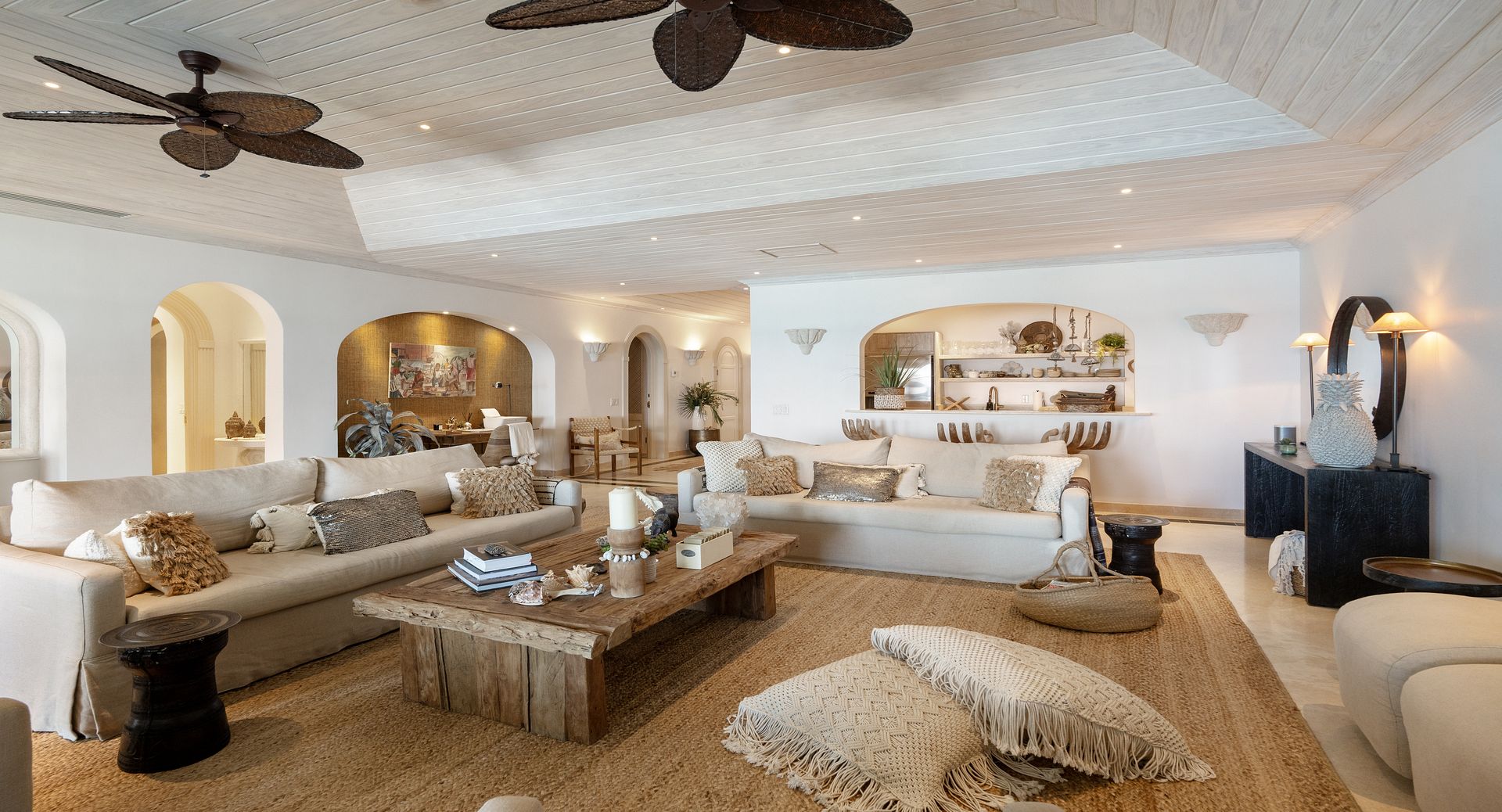 Old Trees Sunset enjoys an elevated sense of privacy and seclusion whilst offering incredible sea views from the moment you enter the property. The apartment showcases a stunning blend of hues, with earthy, organic tones throughout the interiors that beautifully complement the aquamarine waters of the ocean, visible from nearly every corner of the living room space. With high vaulted ceilings and a thoughtfully curated coastal boho design, the apartment seamlessly blends elegance and comfort, creating a warm and inviting atmosphere that reflects the natural beauty of its surroundings. The open-plan layout immediately captivates, drawing your eyes from the modern kitchen through the expansive living room to the covered terrace and the sparkling aquamarine waters beyond. French doors allow for a natural flow between the indoor and outdoor spaces, perfect for enjoying the island’s gentle breezes. The terrace is thoughtfully designed for both relaxation and entertainment, featuring a refreshing plunge pool and a dining area ideal for al fresco meals. It offers the perfect setting for sundowners, with a staircase leading down to the beach for easy access to the shore.