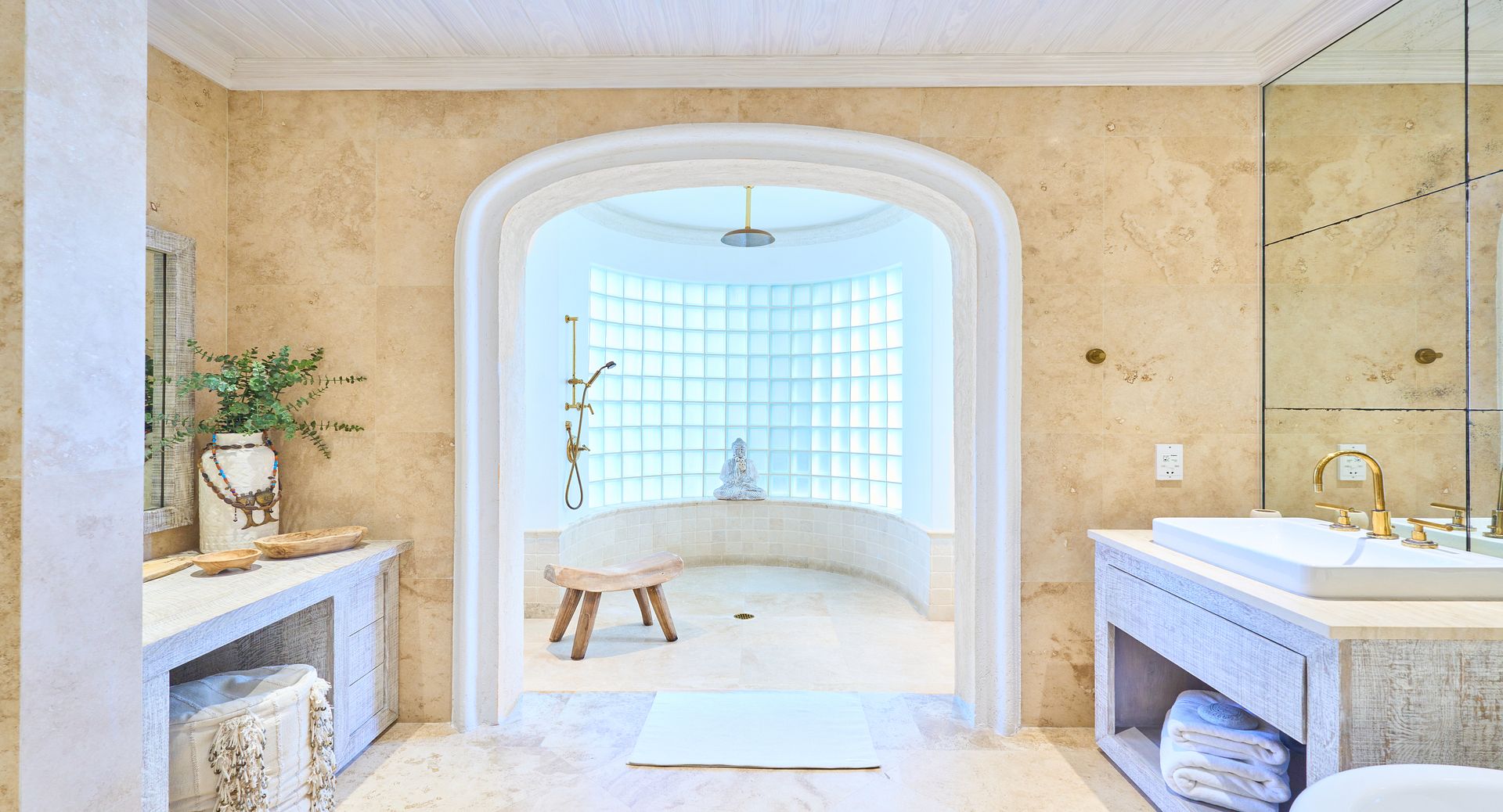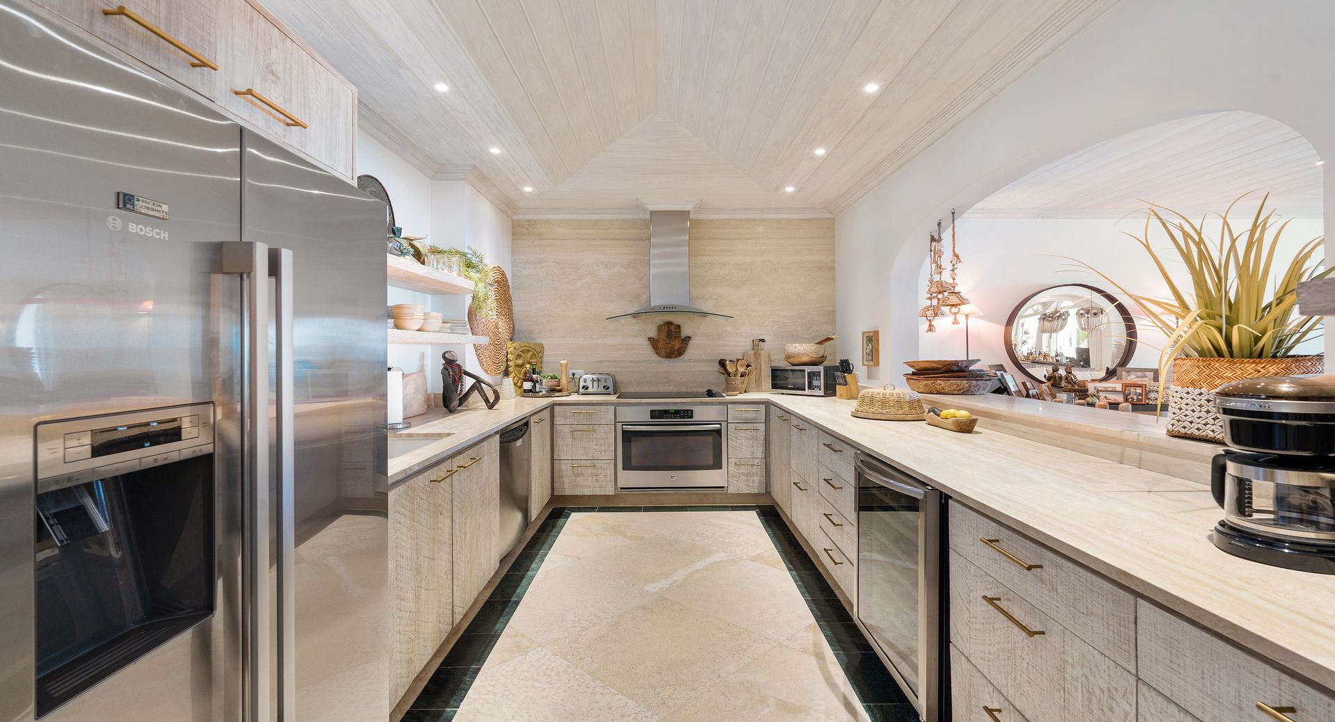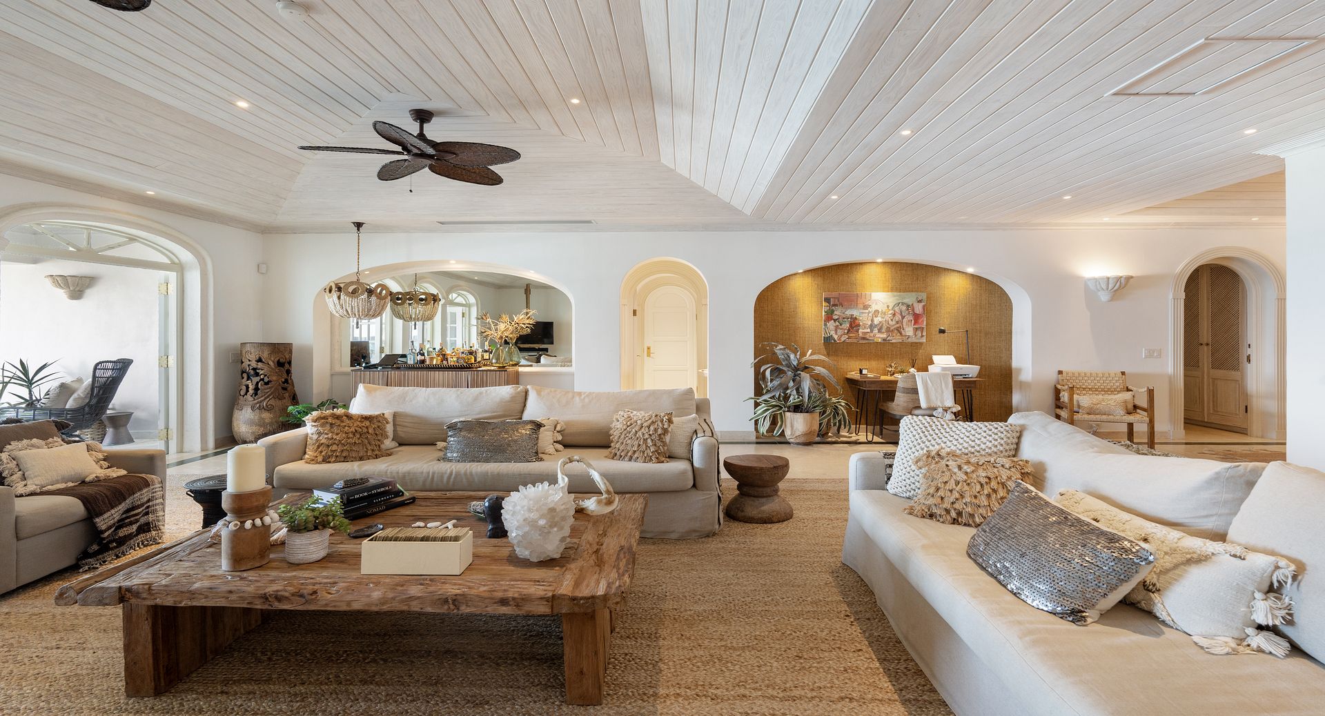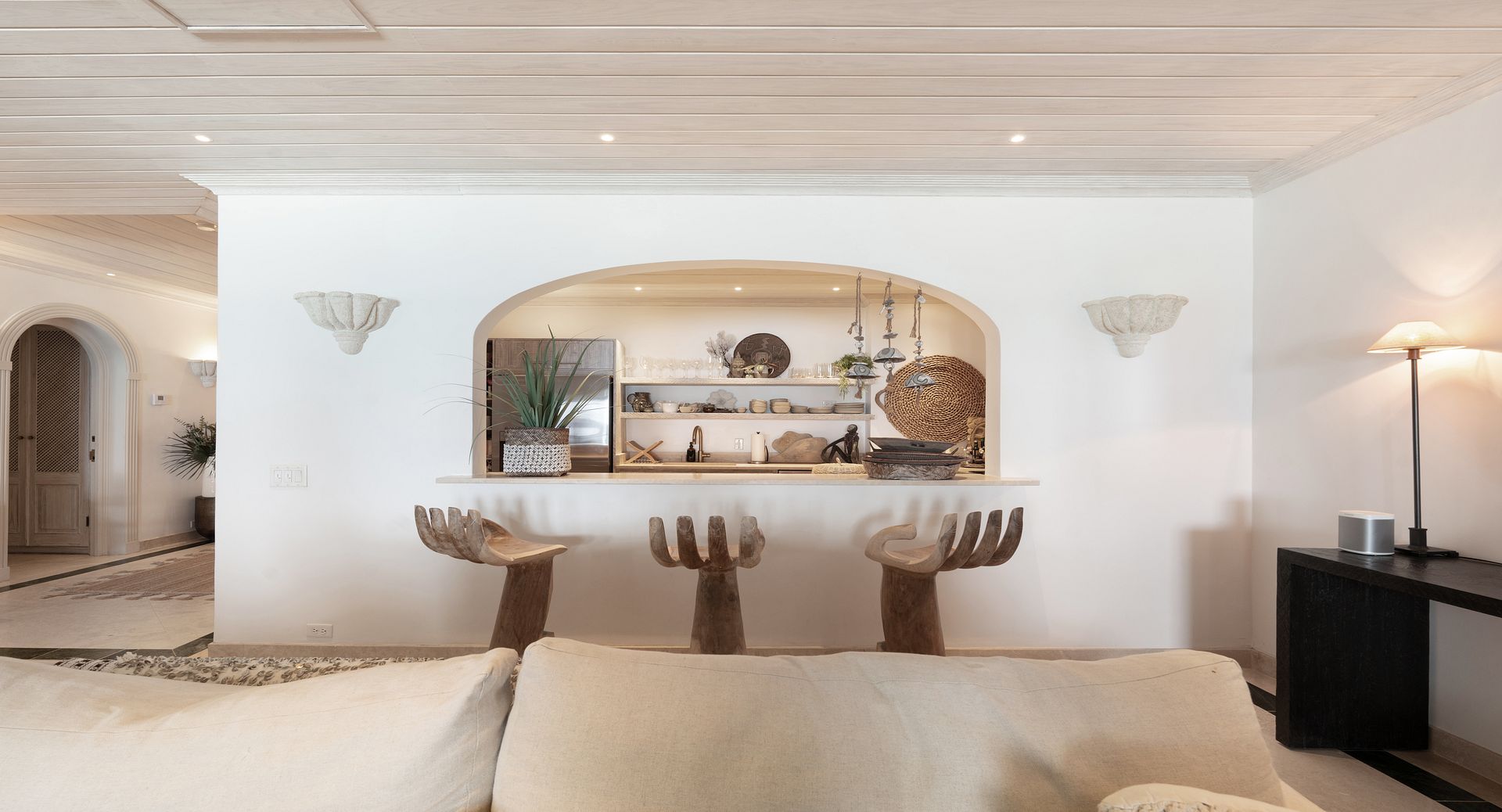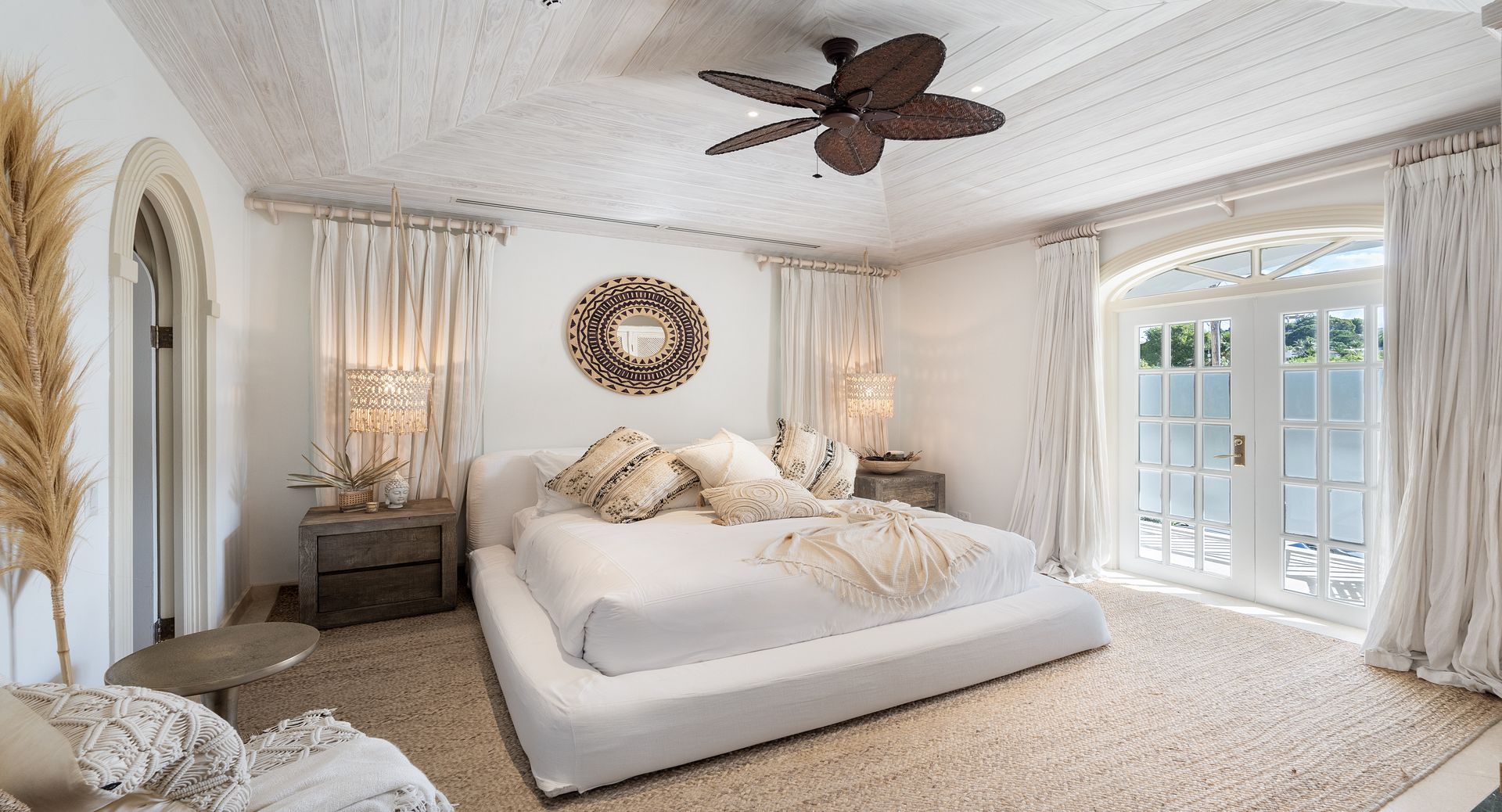 Old Trees Sunset enjoys an elevated sense of privacy and seclusion whilst offering incredible sea views from the moment you enter the property. The apartment showcases a stunning blend of hues, with earthy, organic tones throughout the interiors that beautifully complement the aquamarine waters of the ocean, visible from nearly every corner of the living room space. With high vaulted ceilings and a thoughtfully curated coastal boho design, the apartment seamlessly blends elegance and comfort, creating a warm and inviting atmosphere that reflects the natural beauty of its surroundings. The open-plan layout immediately captivates, drawing your eyes from the modern kitchen through the expansive living room to the covered terrace and the sparkling aquamarine waters beyond. French doors allow for a natural flow between the indoor and outdoor spaces, perfect for enjoying the island’s gentle breezes. The terrace is thoughtfully designed for both relaxation and entertainment, featuring a refreshing plunge pool and a dining area ideal for al fresco meals. It offers the perfect setting for sundowners, with a staircase leading down to the beach for easy access to the shore.