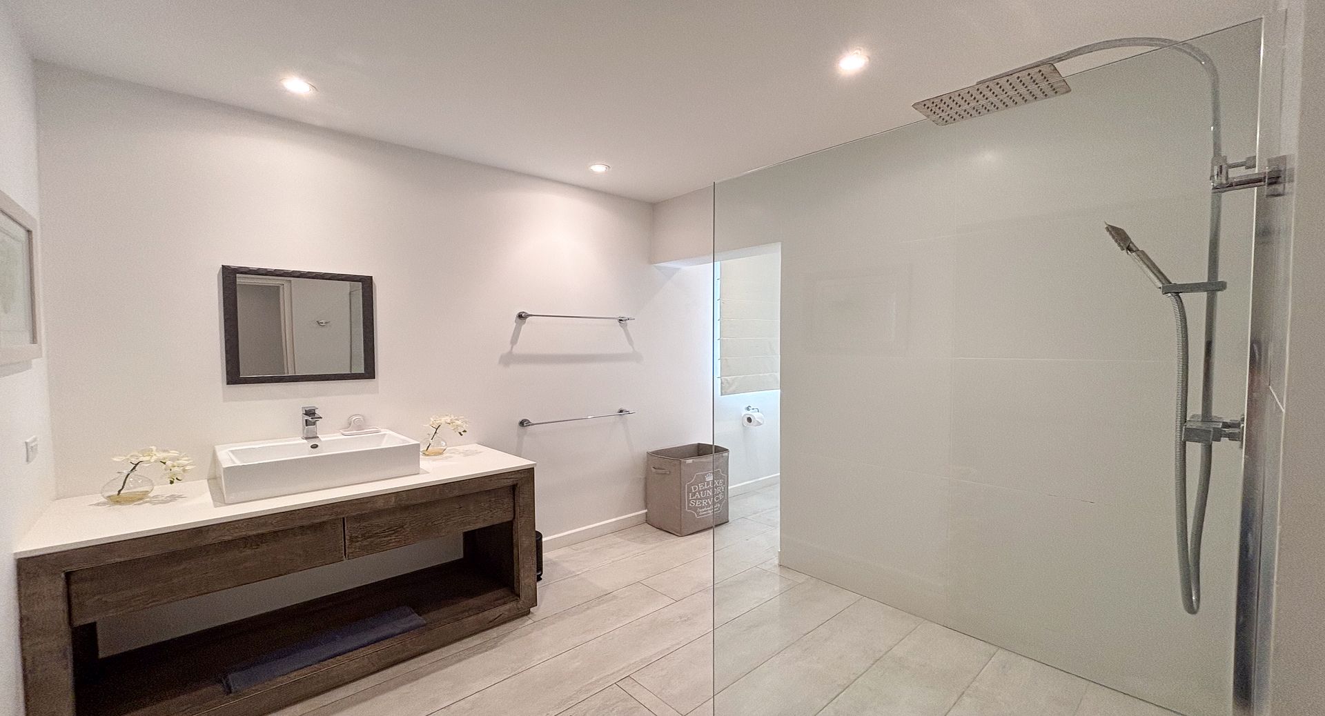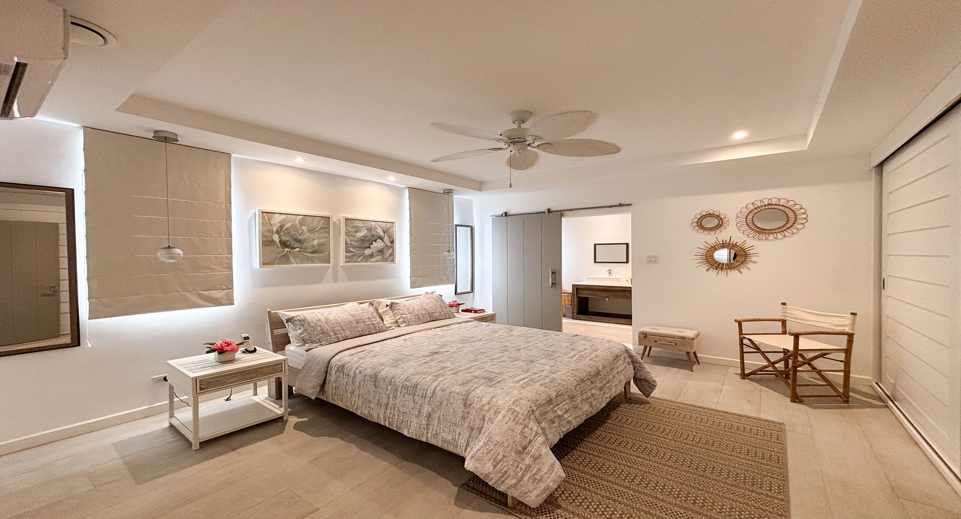 Both bedrooms are fully air-conditioned to ensure cool, restful nights. The serene primary suite features a flat-screen television and a spacious en-suite bathroom complete with double vanities and a luxurious walk-in shower. Soft neutral palettes, natural textures, and contemporary finishes create a calm, refined atmosphere throughout.