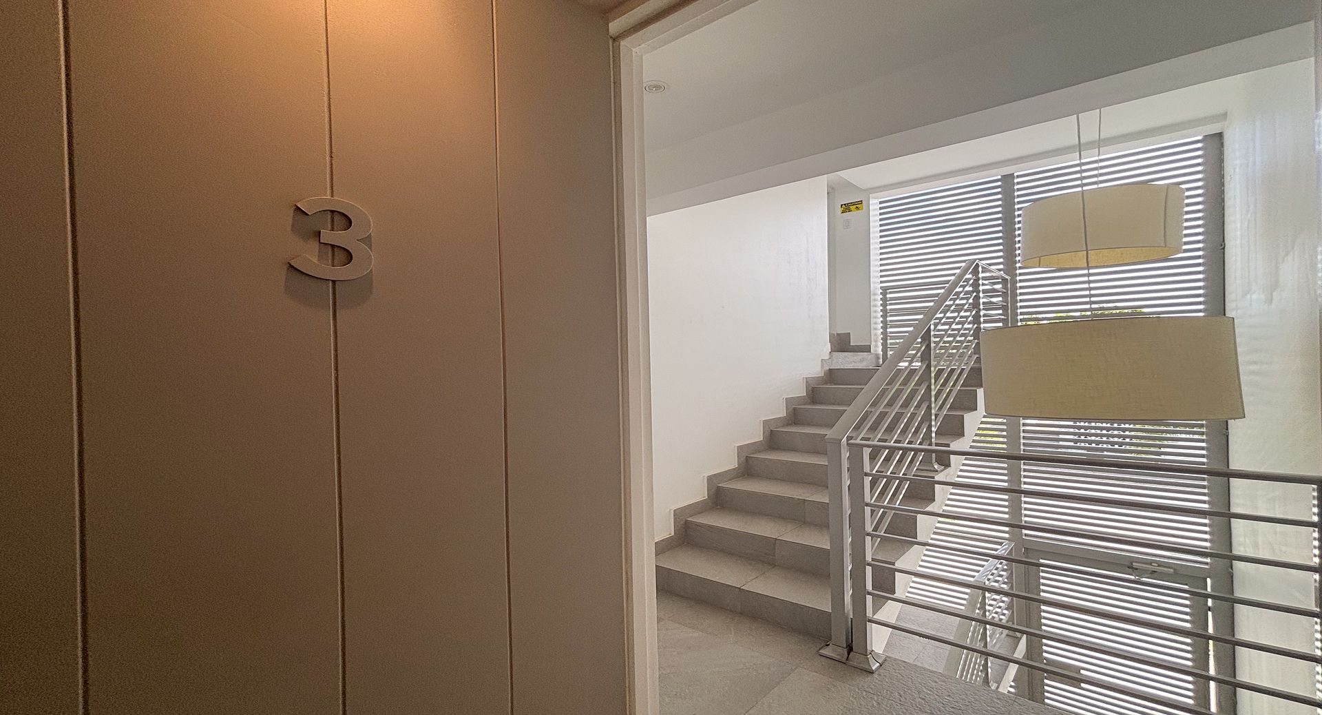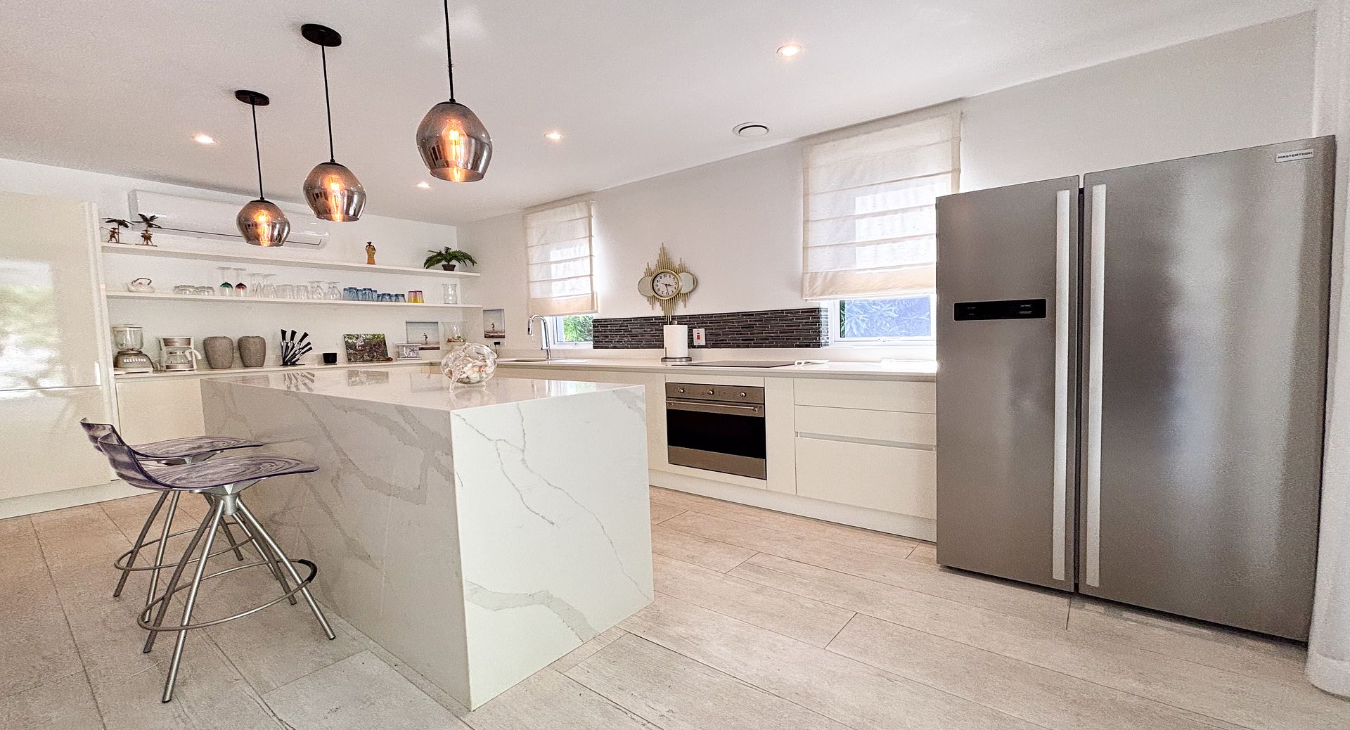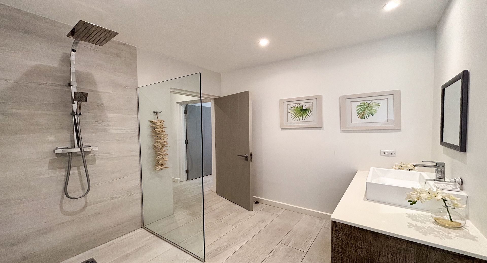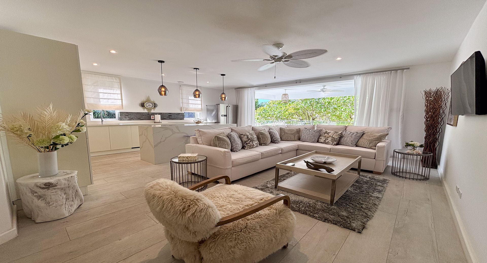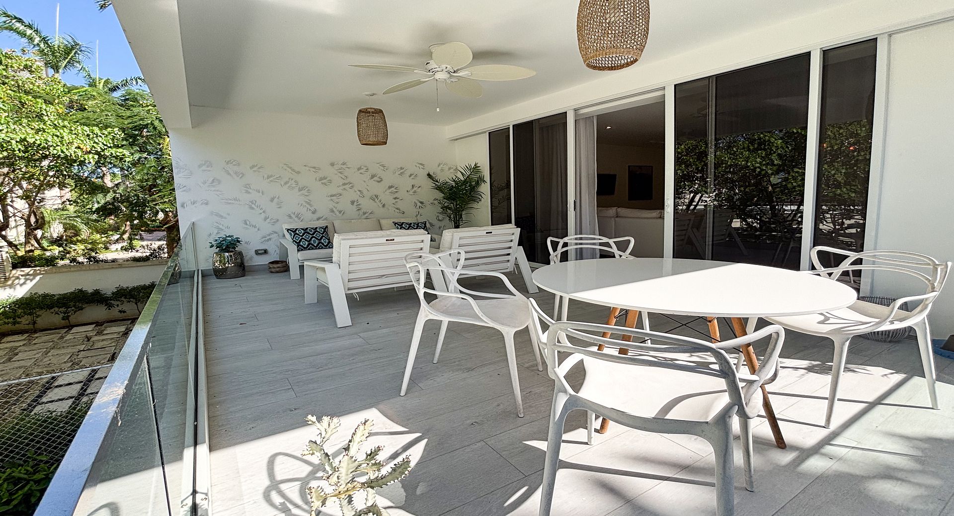 Apartment 3 is a sophisticated second-floor sanctuary spanning 1,500 sq. ft., thoughtfully crafted for relaxed Caribbean living. This stylish 2-bedroom, 2-bathroom residence showcases a sleek open-plan kitchen appointed with premium modern appliances, flowing seamlessly into an inviting living area. Large glass doors open onto a generous covered terrace—ideal for enjoying morning coffees, evening cocktails, and the island’s warm tropical breezes.