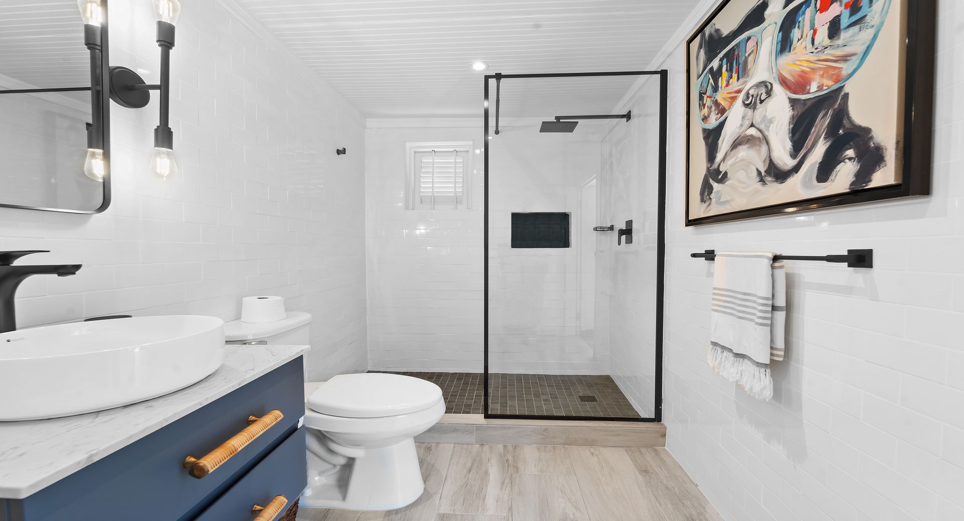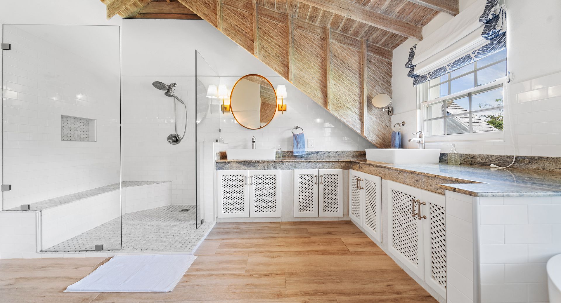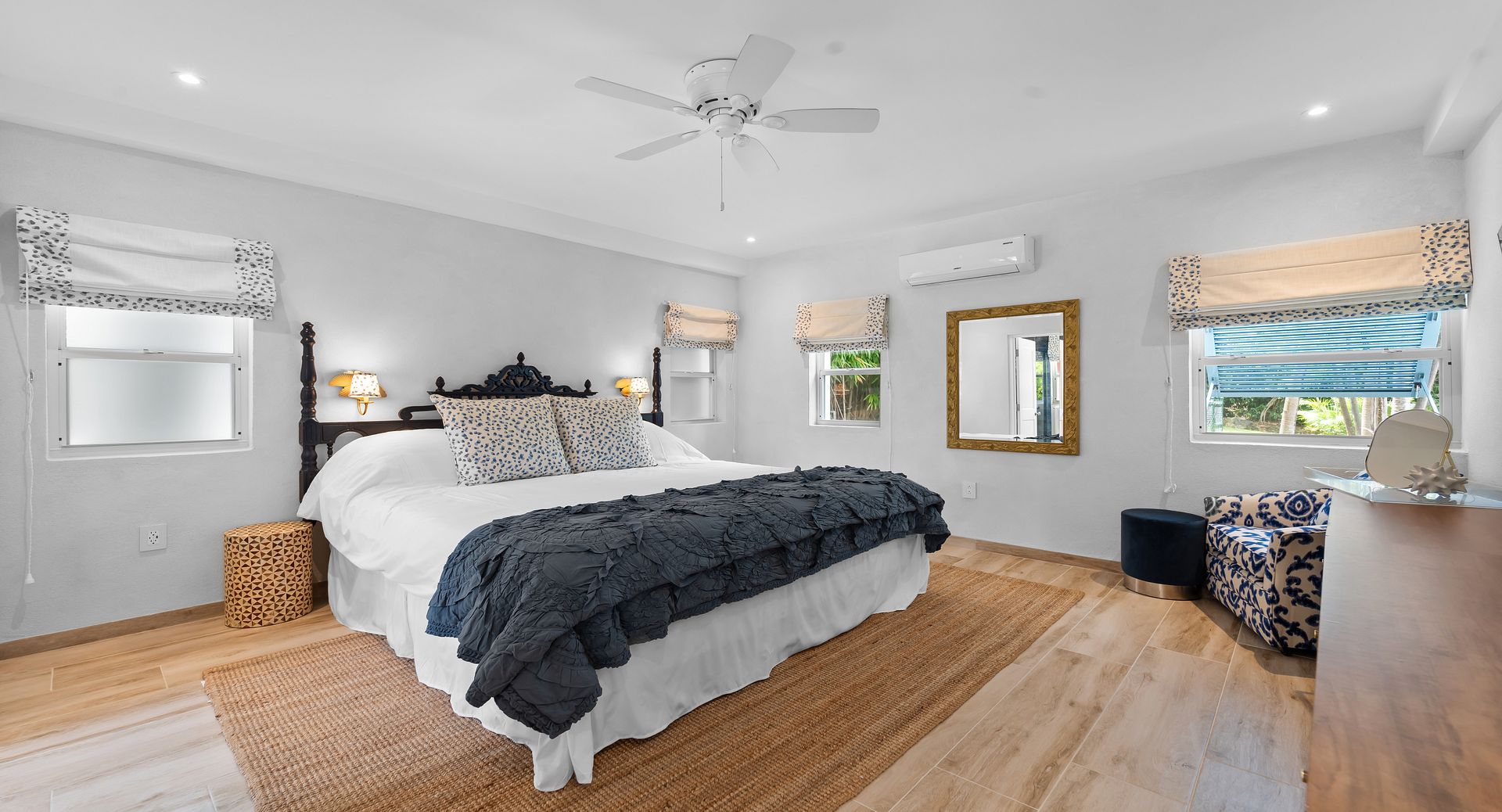 The separate cottage offers flexible accommodations with a primary en-suite bedroom on the ground floor and an upstairs loft featuring four double beds cleverly divided by a privacy curtain-a whimsical, modern take on bunk beds that’s sure to be a hit with all guests. While especially kid-friendly, this space is equally well-suited for adults, offering fun, comfort and flexibility in its creative design.