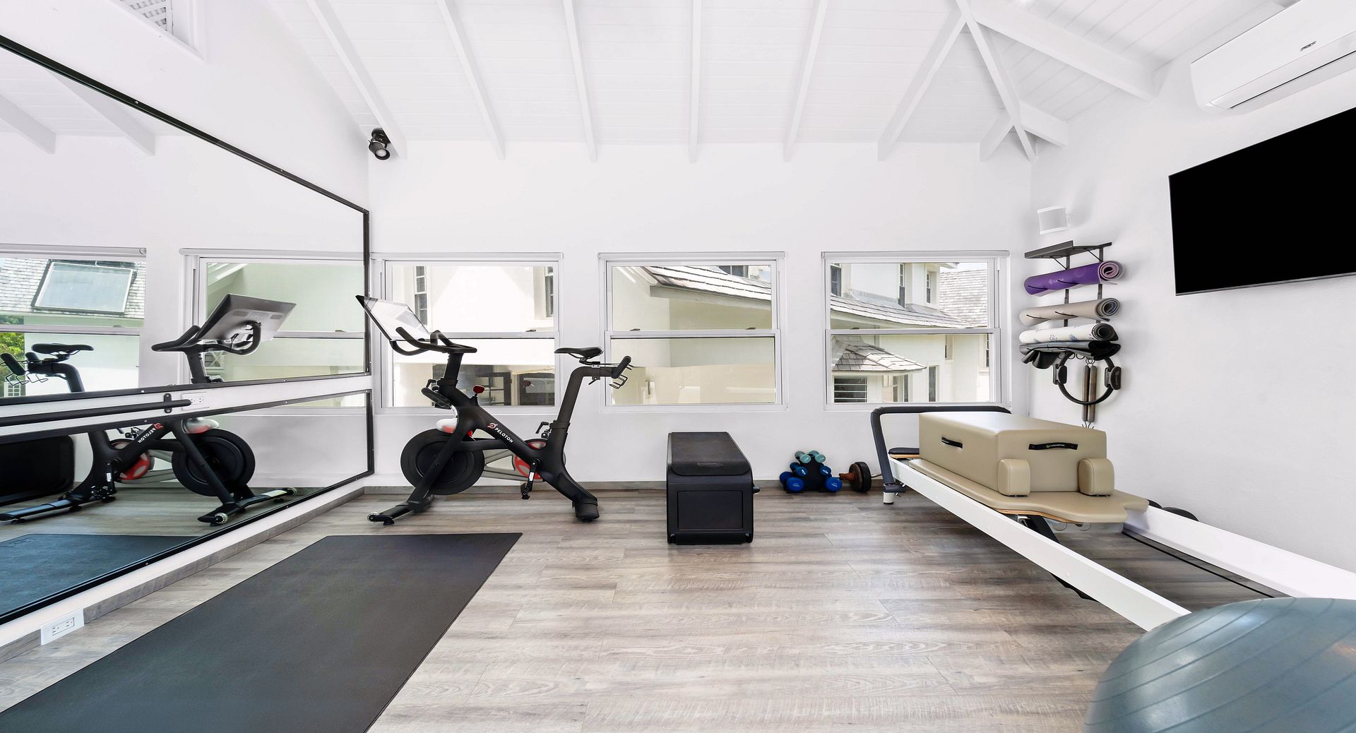The saltwater pool, surrounded by loungers and umbrellas, overlooks the polo field with panoramic views that stretch to the sea. Nearby, a firepit offers the perfect place to gather and enjoy the island’s unforgettable West Coast sunsets. For fun family activities, Polo View offers table tennis, a fully equipped gym with a Peloton bike and Pilates reformer, and an outdoor playground tucked behind the cottage—perfect for younger guests.