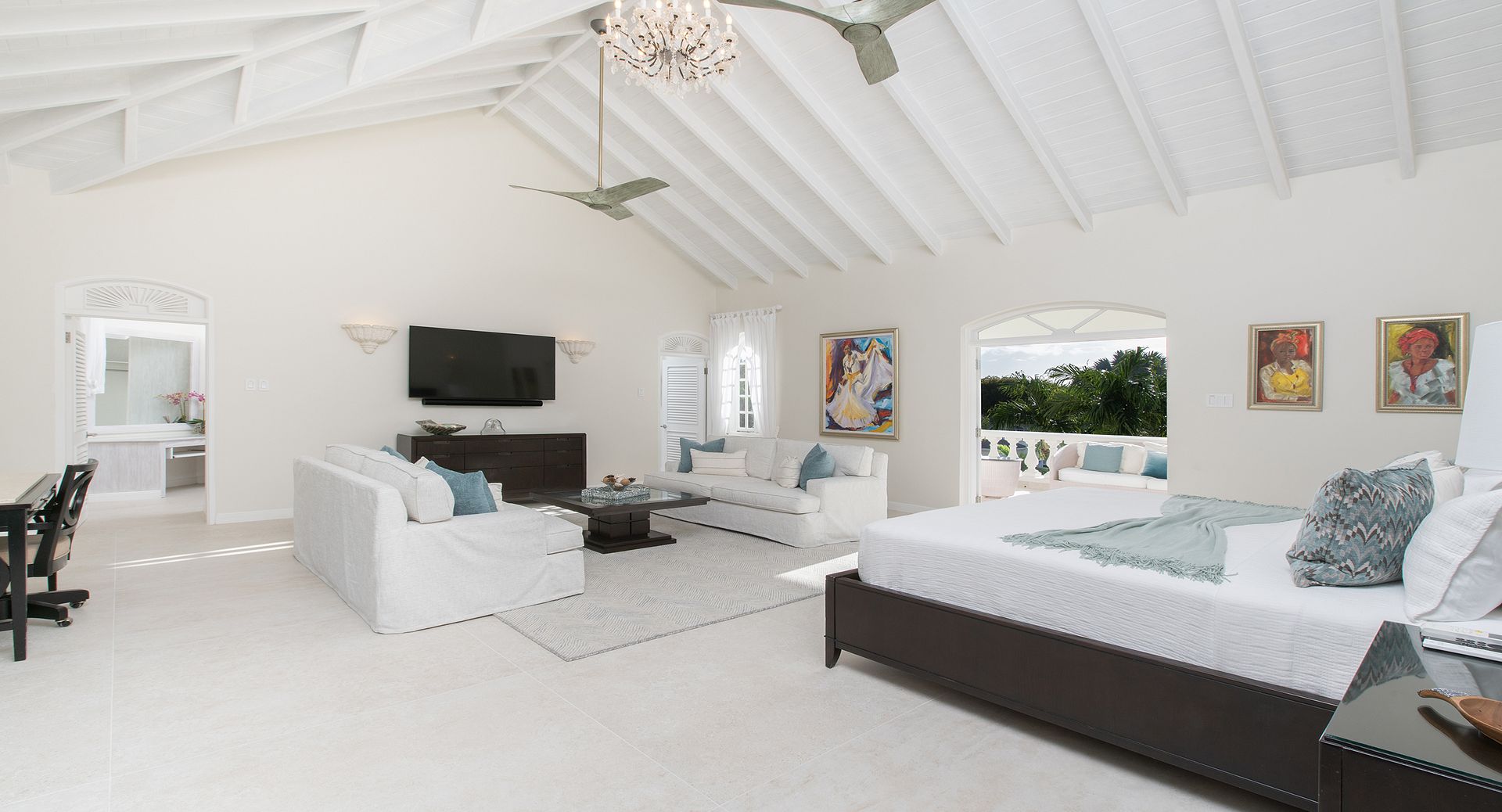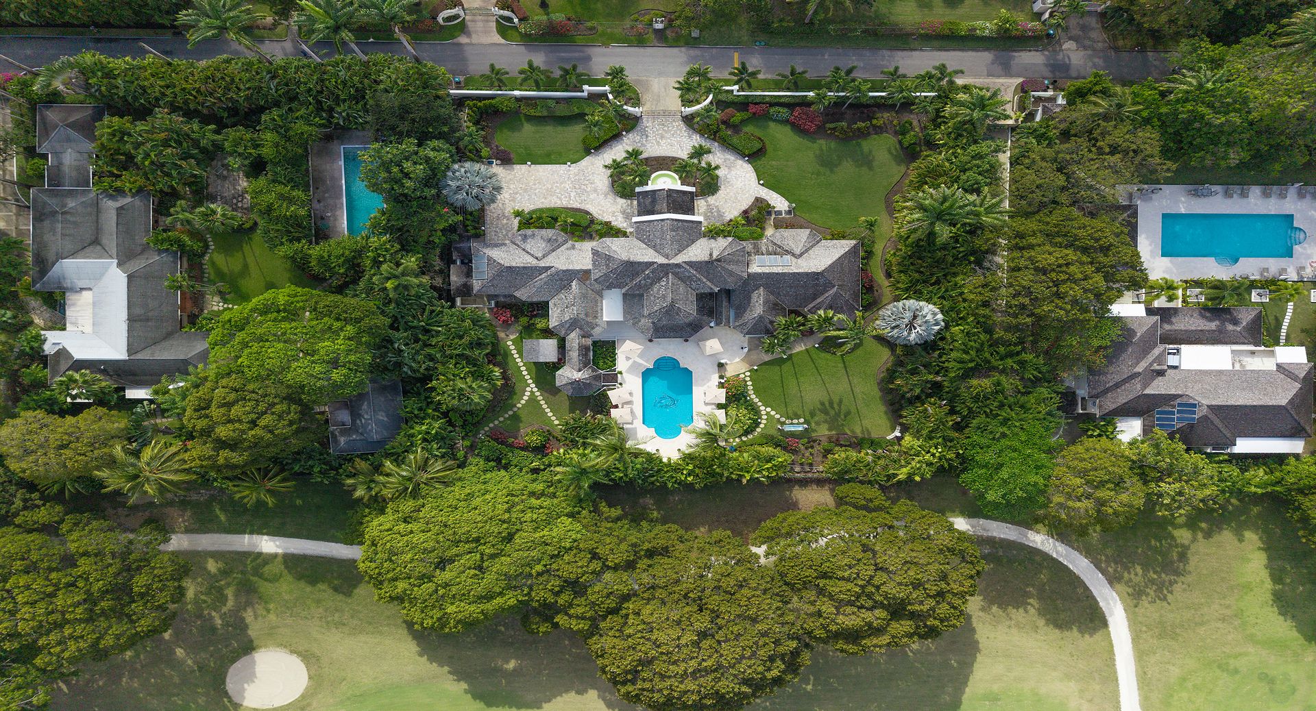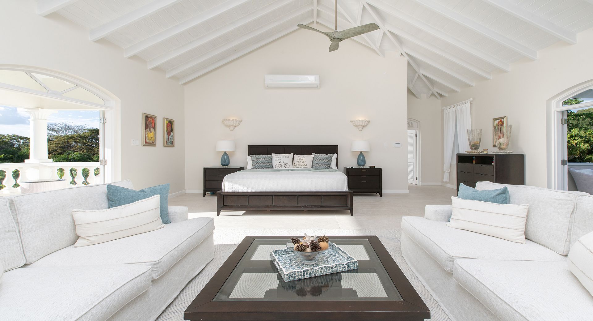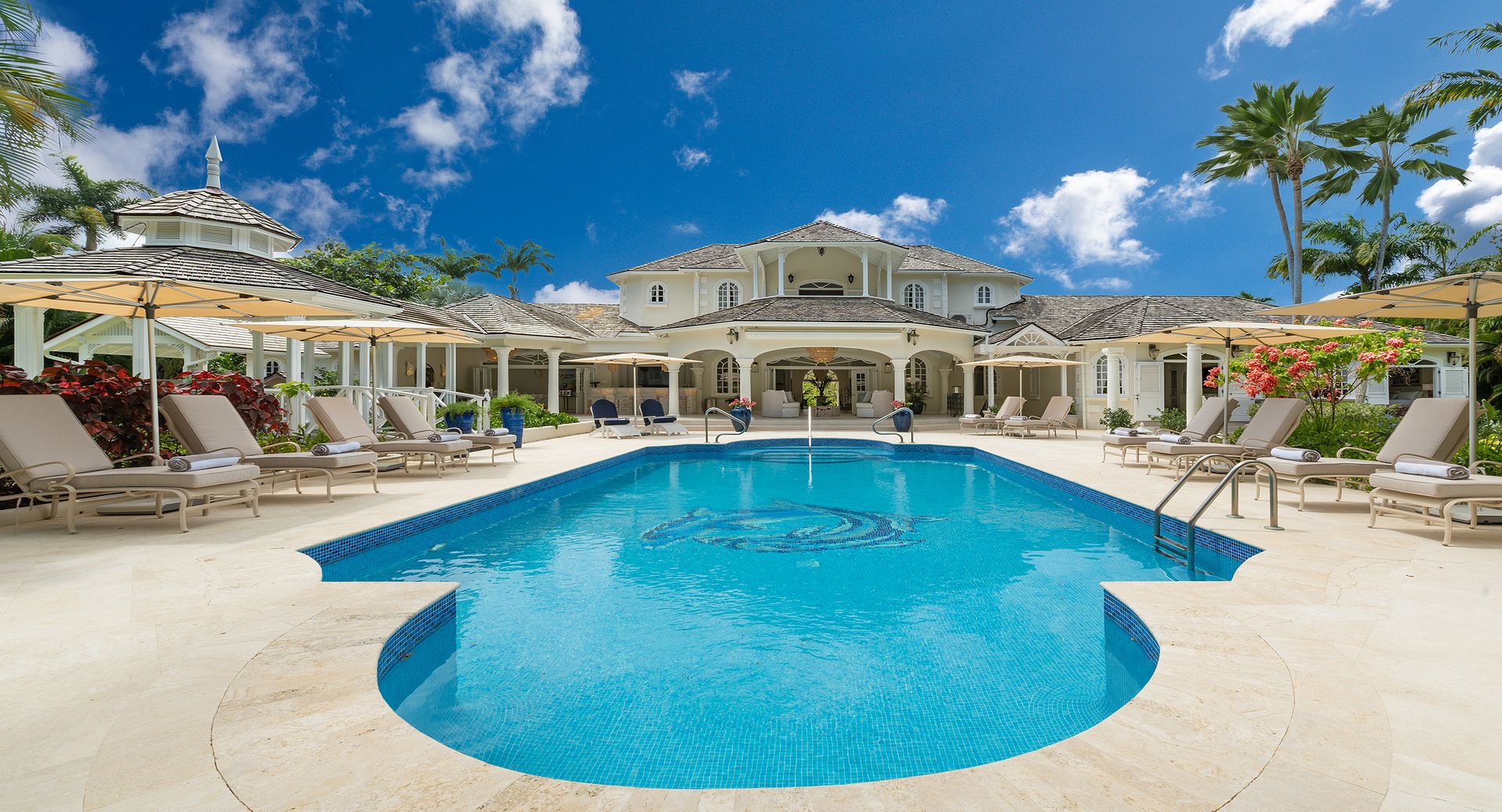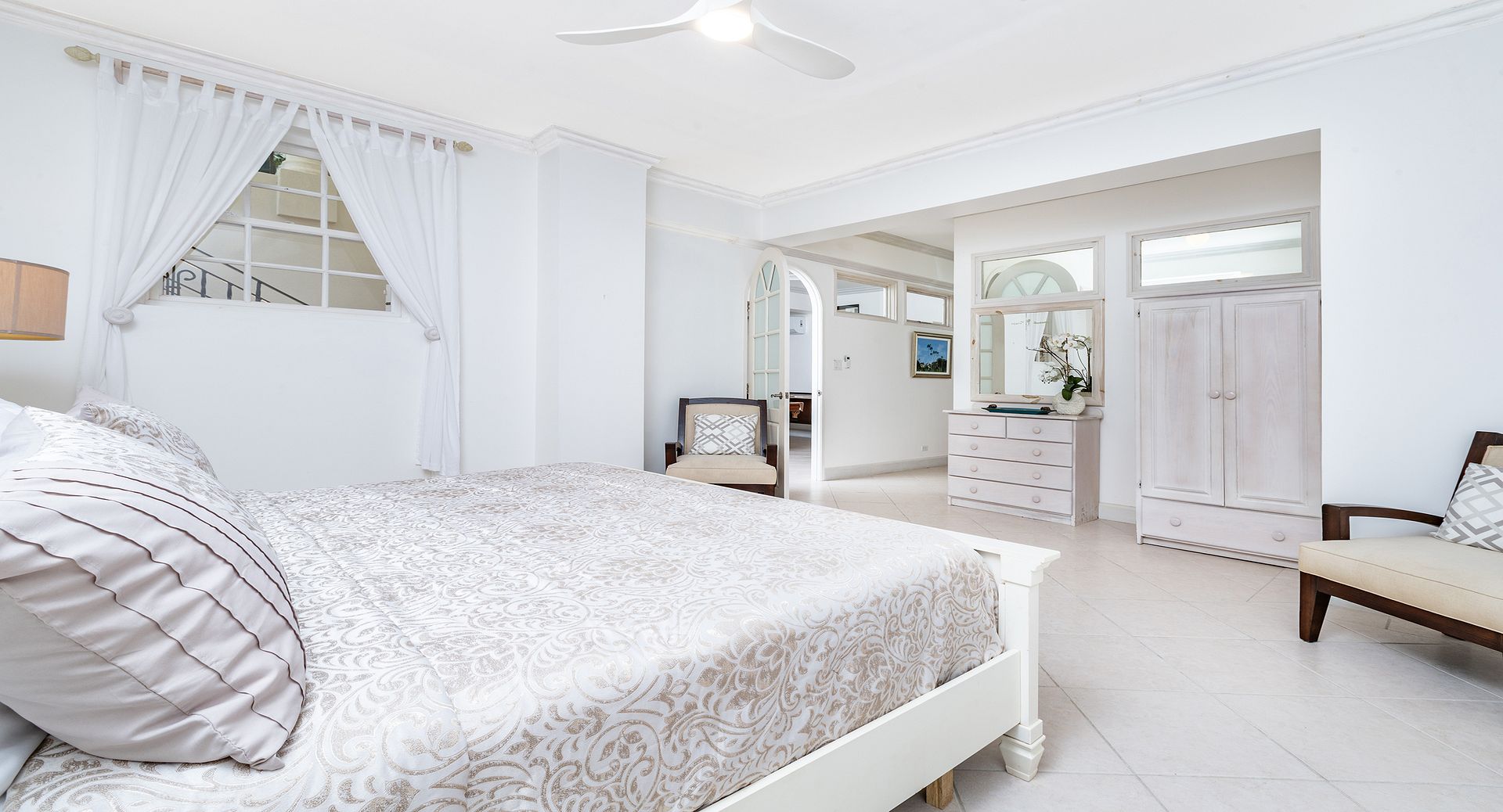 Occupying the entire first floor, the impressive 1,400 sq. ft. master suite offers a private sanctuary with sweeping views over the pool and gardens of the estate. This luxurious retreat features dual walk-in closets and an indulgent en-suite bathroom complete with a Jacuzzi tub, as well as private balconies that invite in the island breeze.