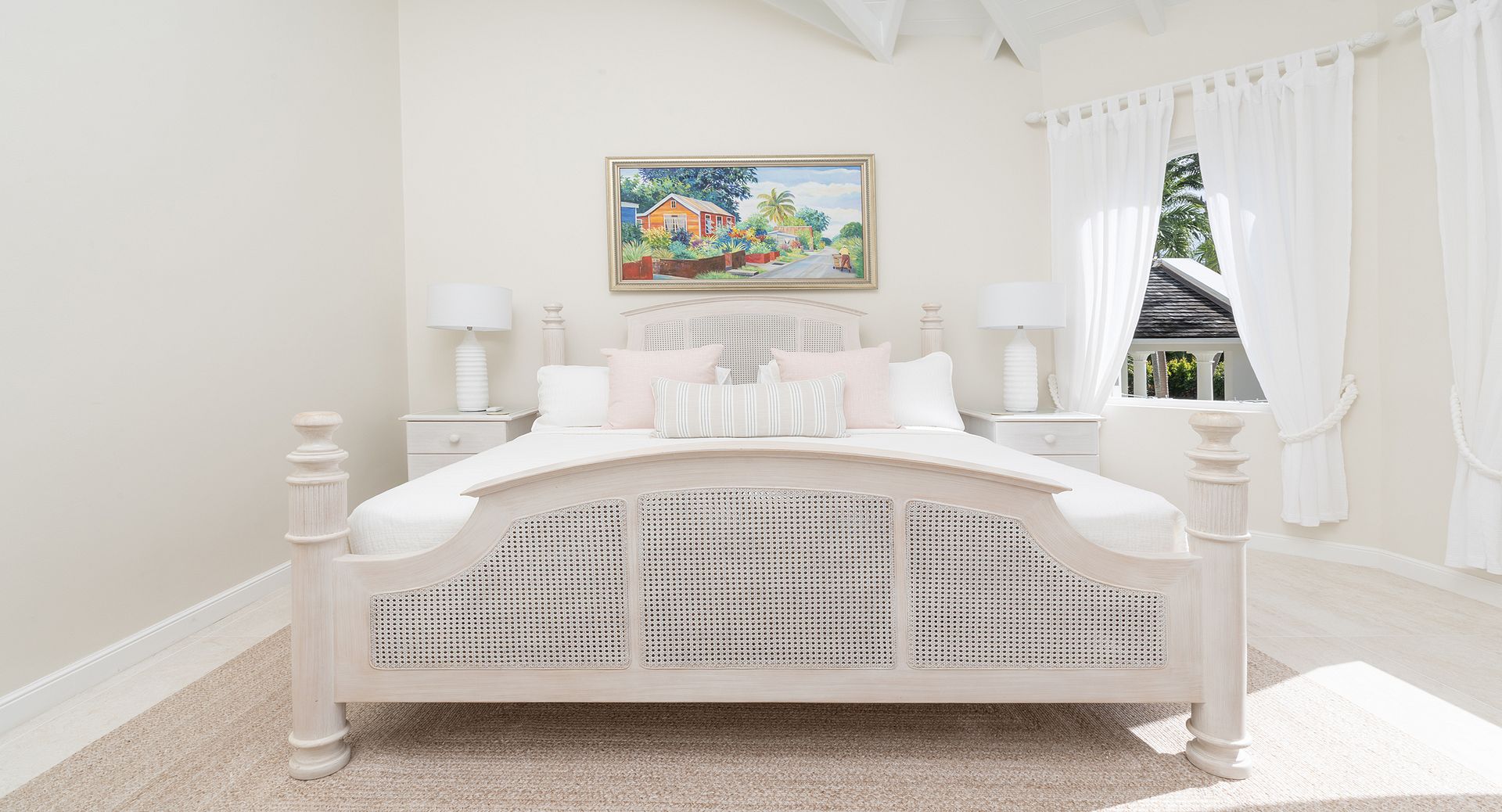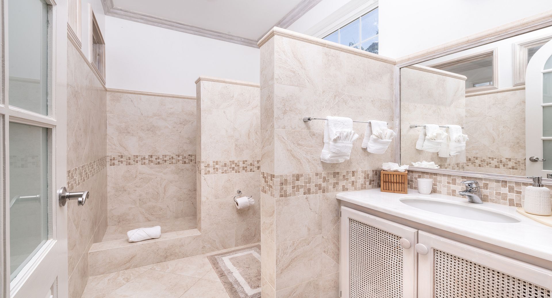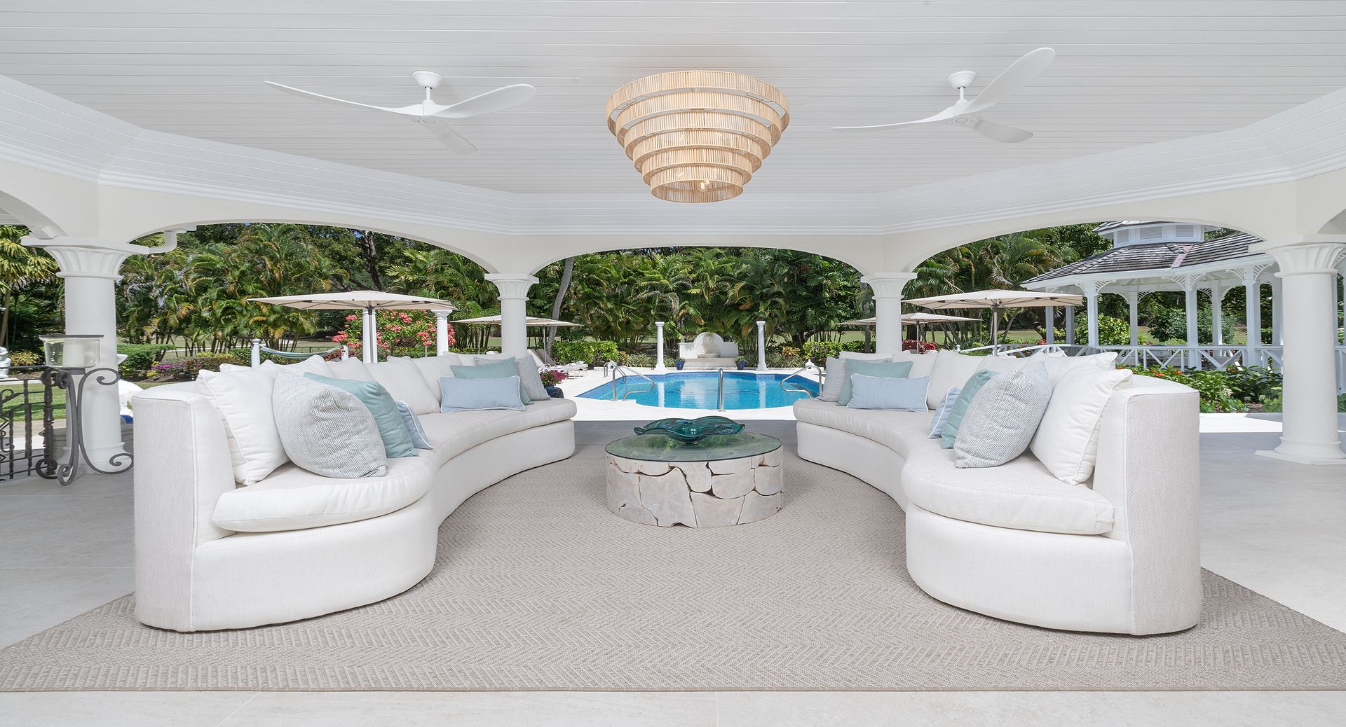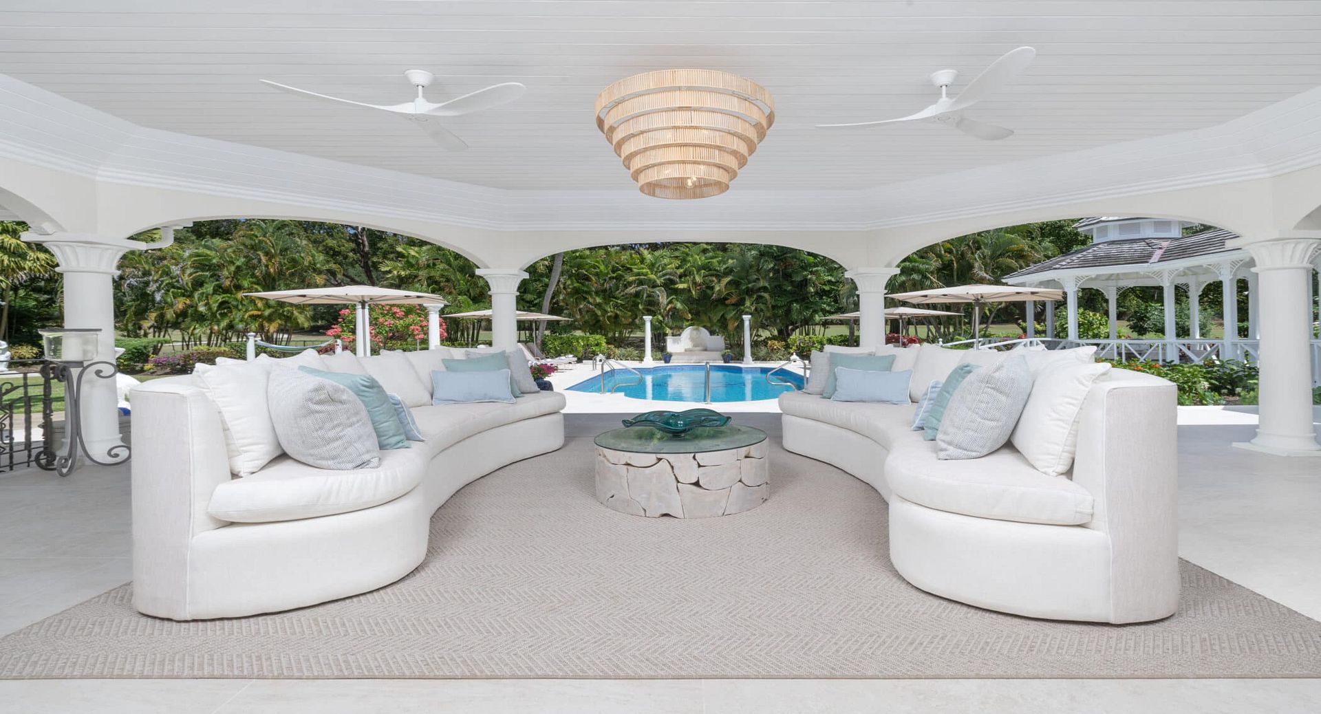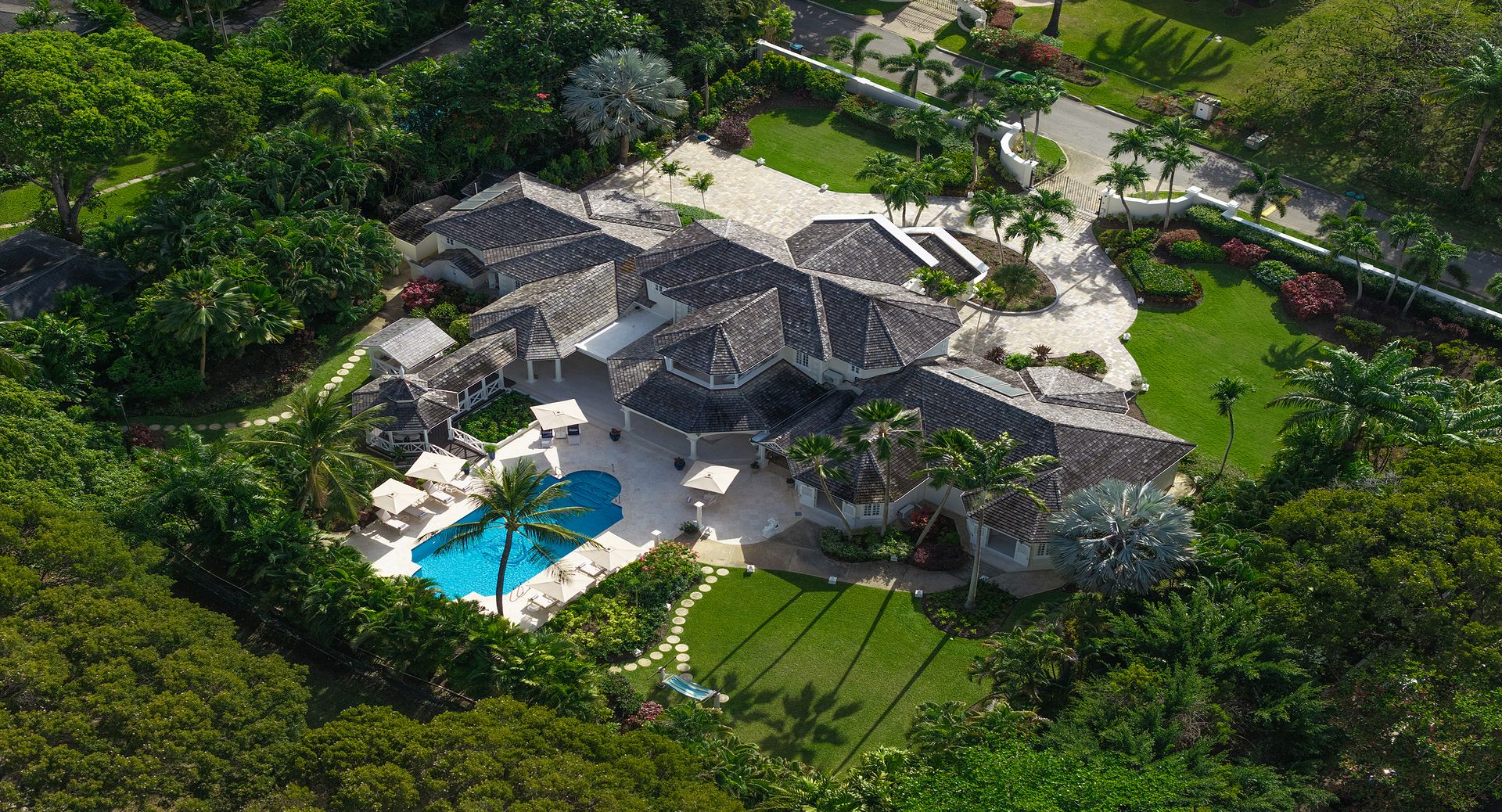 Occupying the entire first floor, the impressive 1,400 sq. ft. master suite offers a private sanctuary with sweeping views over the pool and gardens of the estate. This luxurious retreat features dual walk-in closets and an indulgent en-suite bathroom complete with a Jacuzzi tub, as well as private balconies that invite in the island breeze.