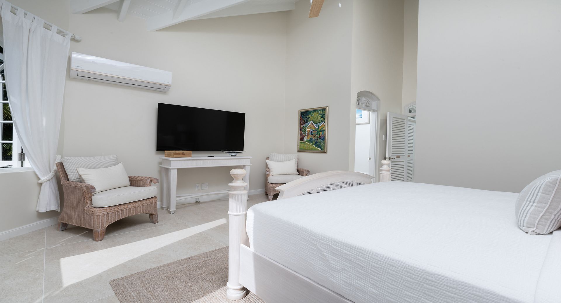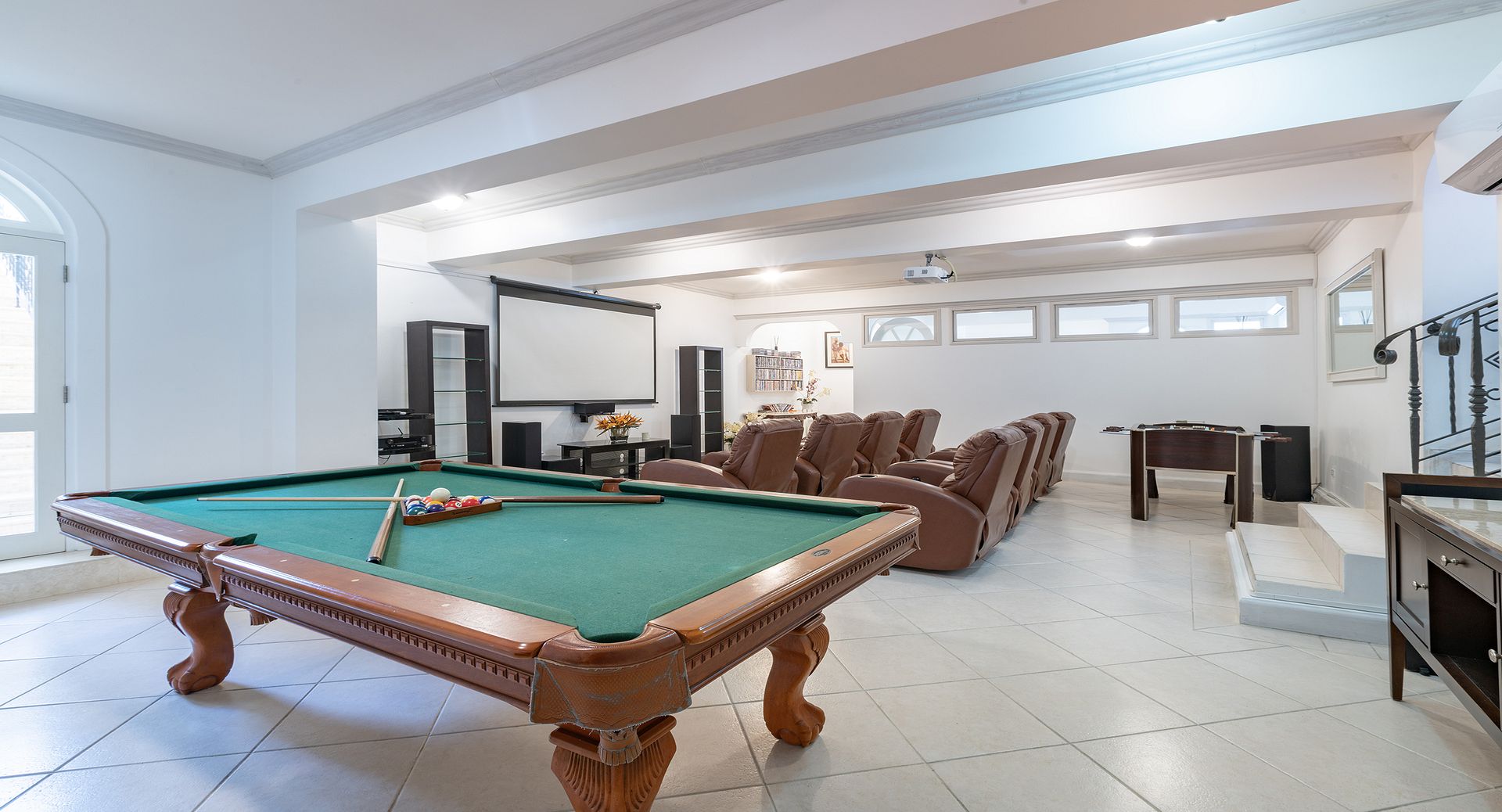 On the lower level, two further guest suites provide additional accommodation, alongside a state-of-the-art home theatre — perfect for relaxed evenings after a day in the sun. Throughout the villa, tasteful furnishings, curated artwork, and modern entertainment systems in each bedroom ensure both comfort and sophistication.