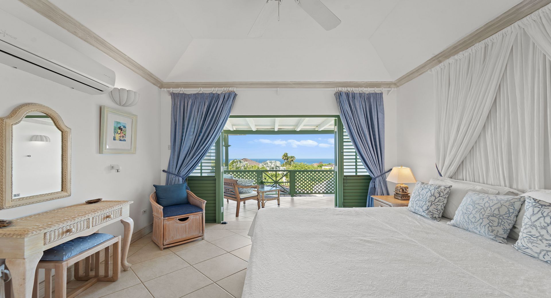 On the ground level, the spacious living area flows effortlessly onto a covered deck designed for relaxation. Take a dip in your private dipping pool, lounge under umbrellas while enjoying the gentle island breeze, or dine al fresco in the dedicated outdoor dining space, all while soaking in breathtaking sea vistas. The newly updated kitchen is fully equipped, making it effortless to prepare everything from light snacks to full meals. One of the villa’s en-suite bedrooms is also located on this level, with French doors that open directly onto the deck, connecting indoor and outdoor living with ease.