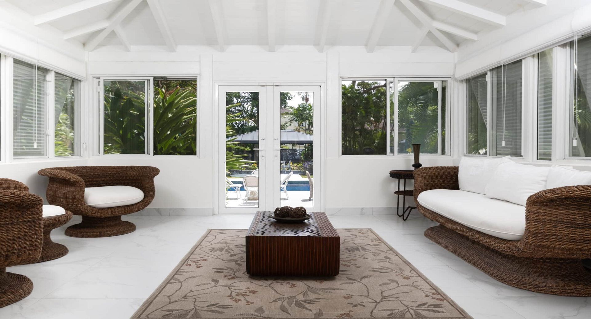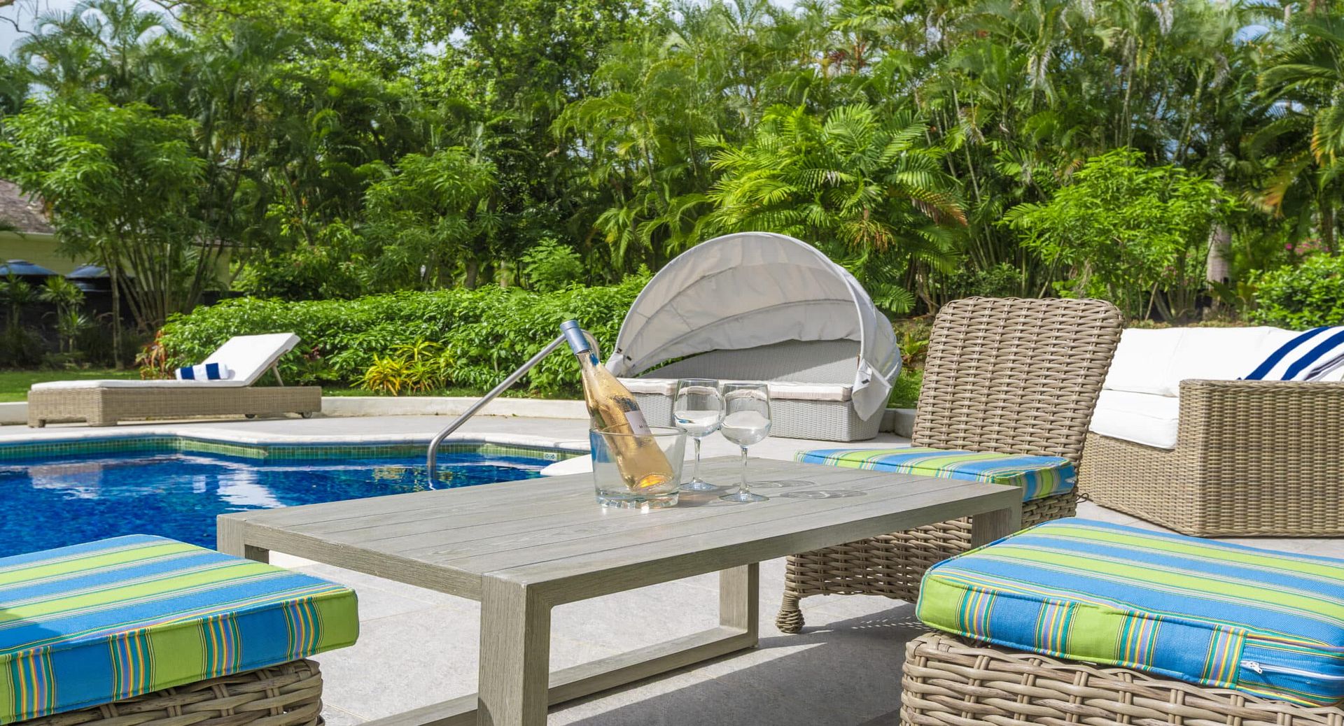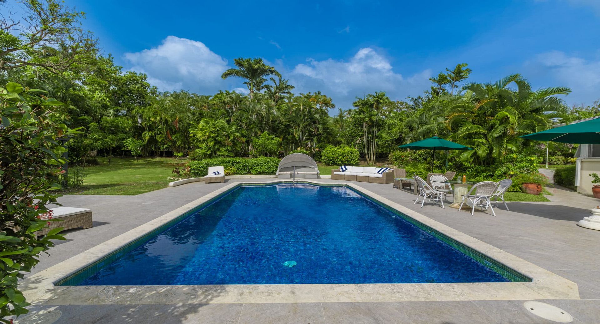 Outdoors, a large private swimming pool is surrounded by lush landscaping, creating a tranquil haven for sun-soaked afternoons.