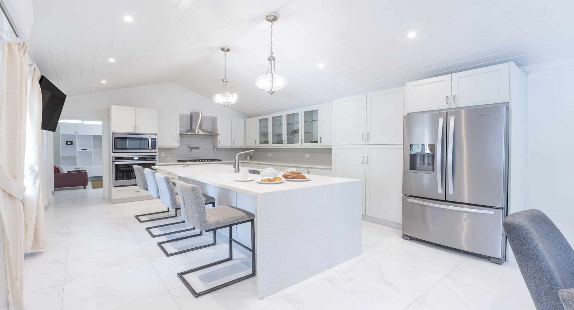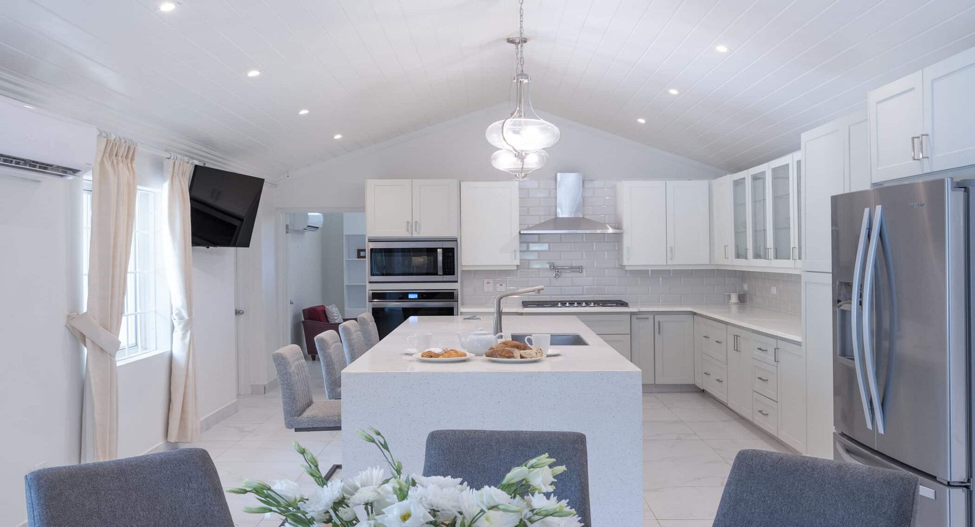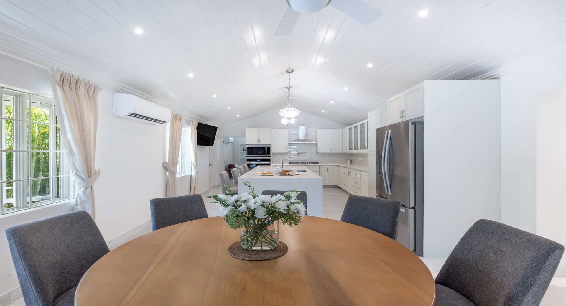 The villa’s interiors are bright and inviting, with a spacious living room framed by vaulted ceilings, a formal dining room, and a dedicated TV lounge. Two covered terraces provide ideal spots for relaxed outdoor dining or cooling off in the shade. At the heart of the home, a sleek modern kitchen with granite countertops makes entertaining effortless.