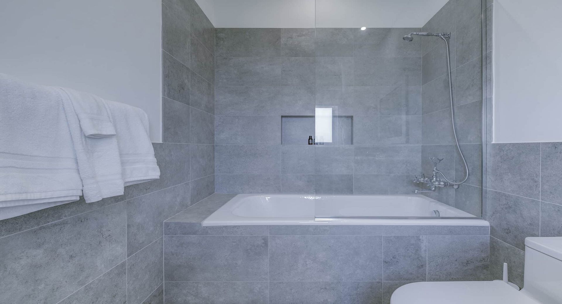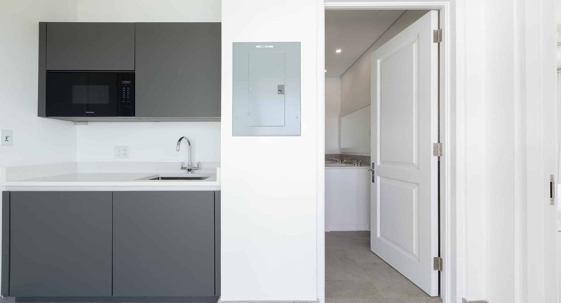 Inside the main house, a bright, open living room introduces a calm, modern aesthetic. An oversized sectional and 75-inch LG Smart TV create a welcoming space for movie nights or quiet downtime. The ultra-modern kitchen is a chef’s dream, anchored by a large island and fully equipped with premium appliances, including a Miele induction cooktop, double oven, wine fridge, coffee maker, and double-door refrigerator with ice maker. Whether you’re preparing a simple breakfast or hosting a relaxed dinner, the space is designed for effortless entertaining.