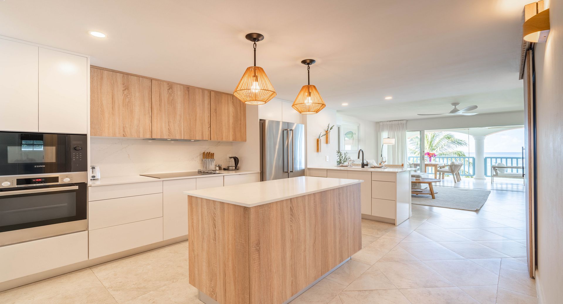 Both bedrooms are en suite and thoughtfully designed to offer privacy and relaxation. The master suite opens directly onto the terrace, allowing you to wake to gentle sea breezes and Caribbean views each morning. The second bedroom provides flexible sleeping arrangements for families or friends, and both bathrooms are finished with sleek, contemporary touches that elevate your stay.