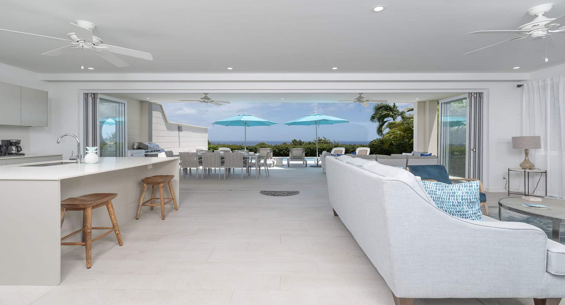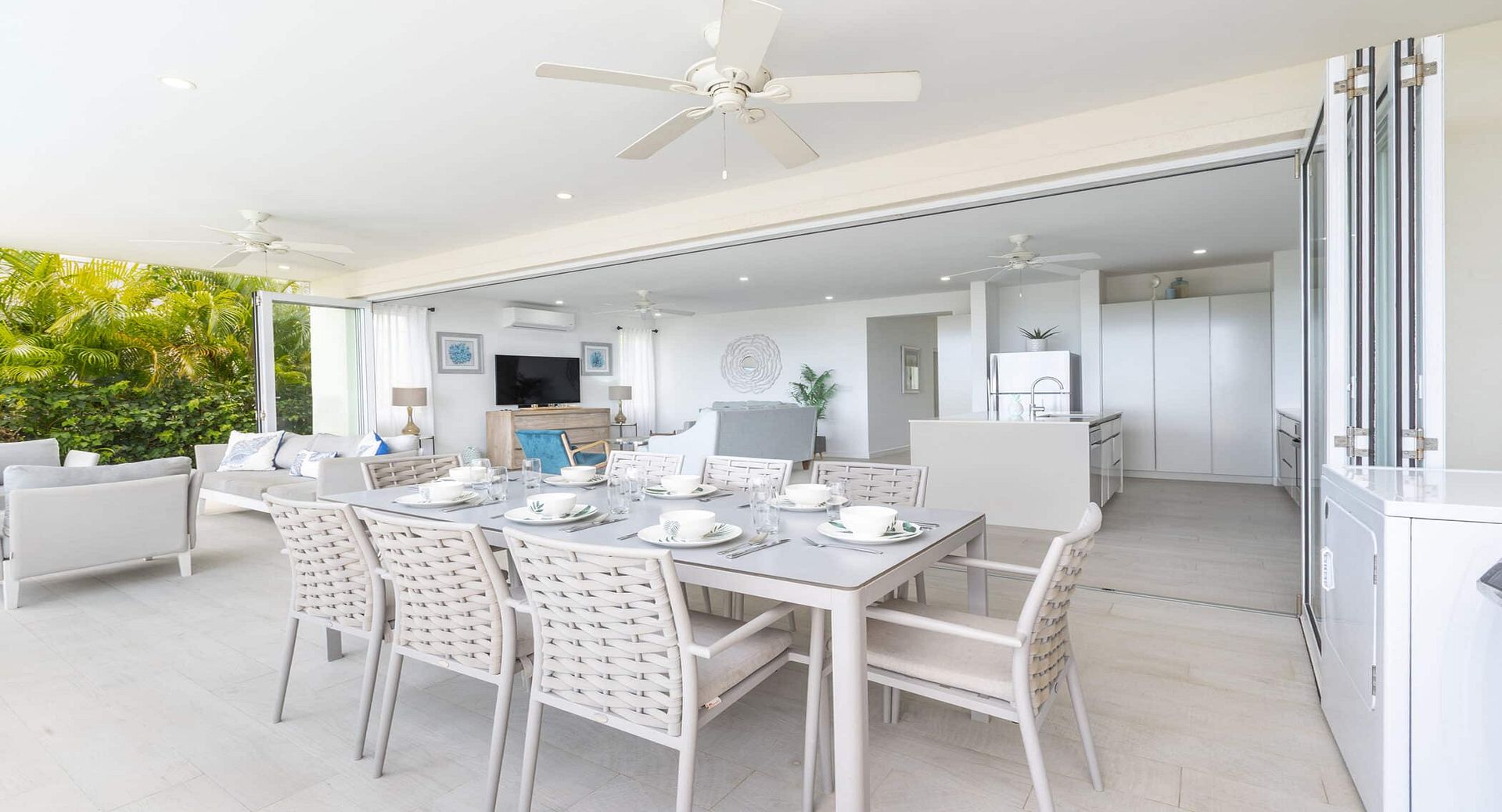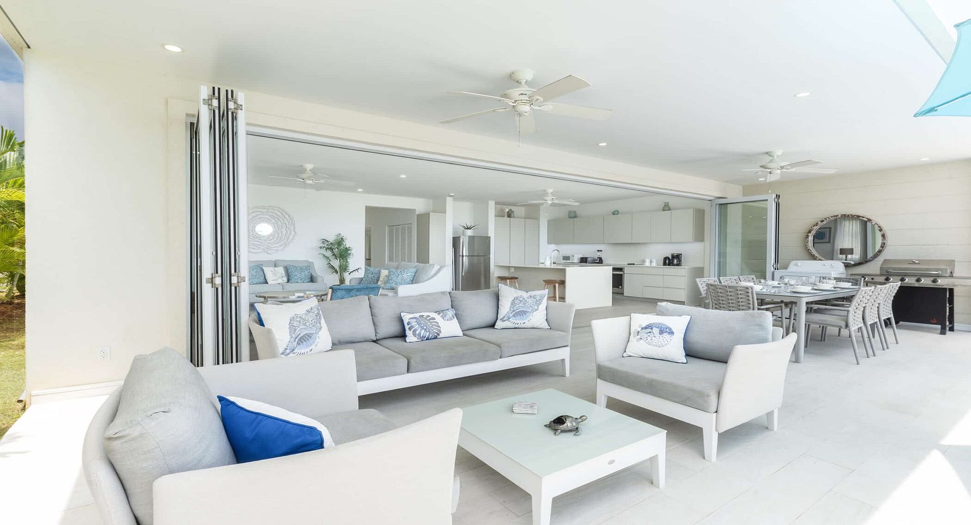 Inside, the villa exudes modern Caribbean charm with an open-plan living and dining area that flows seamlessly onto the patio. The fully equipped kitchen, complete with contemporary appliances, is perfect for preparing meals at home or hosting friends.