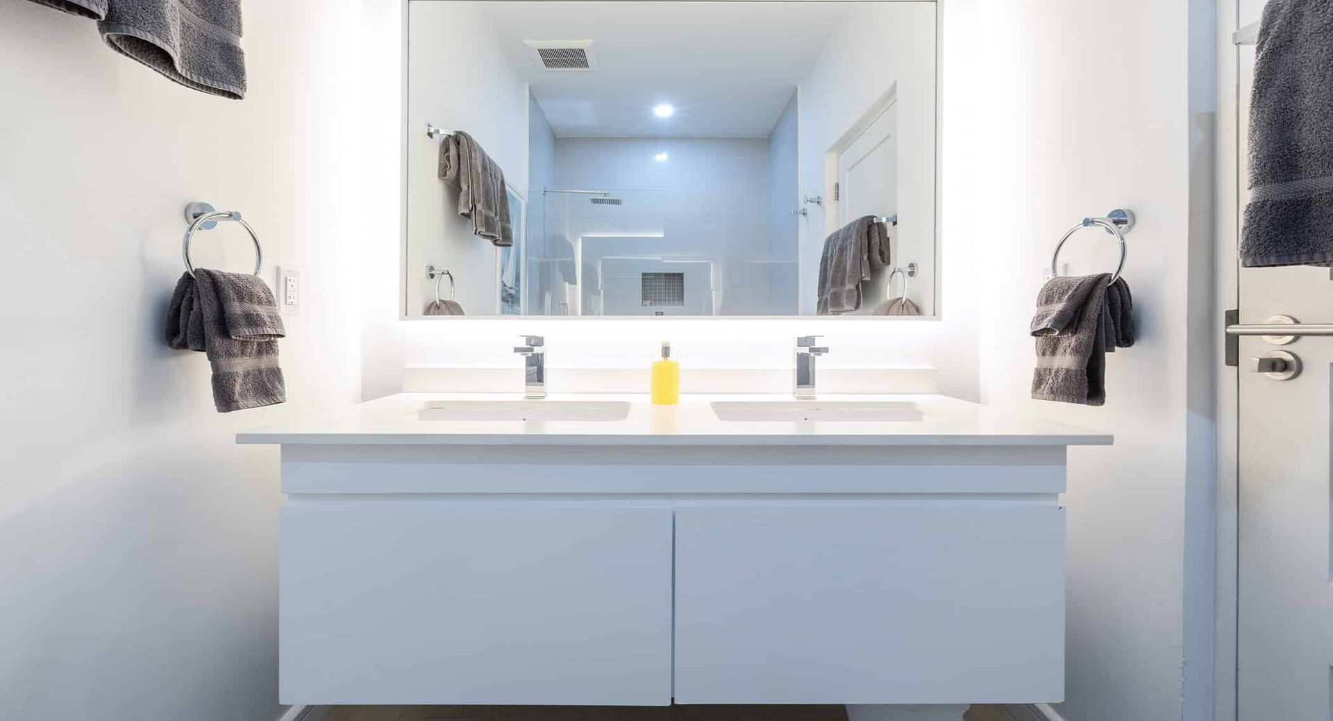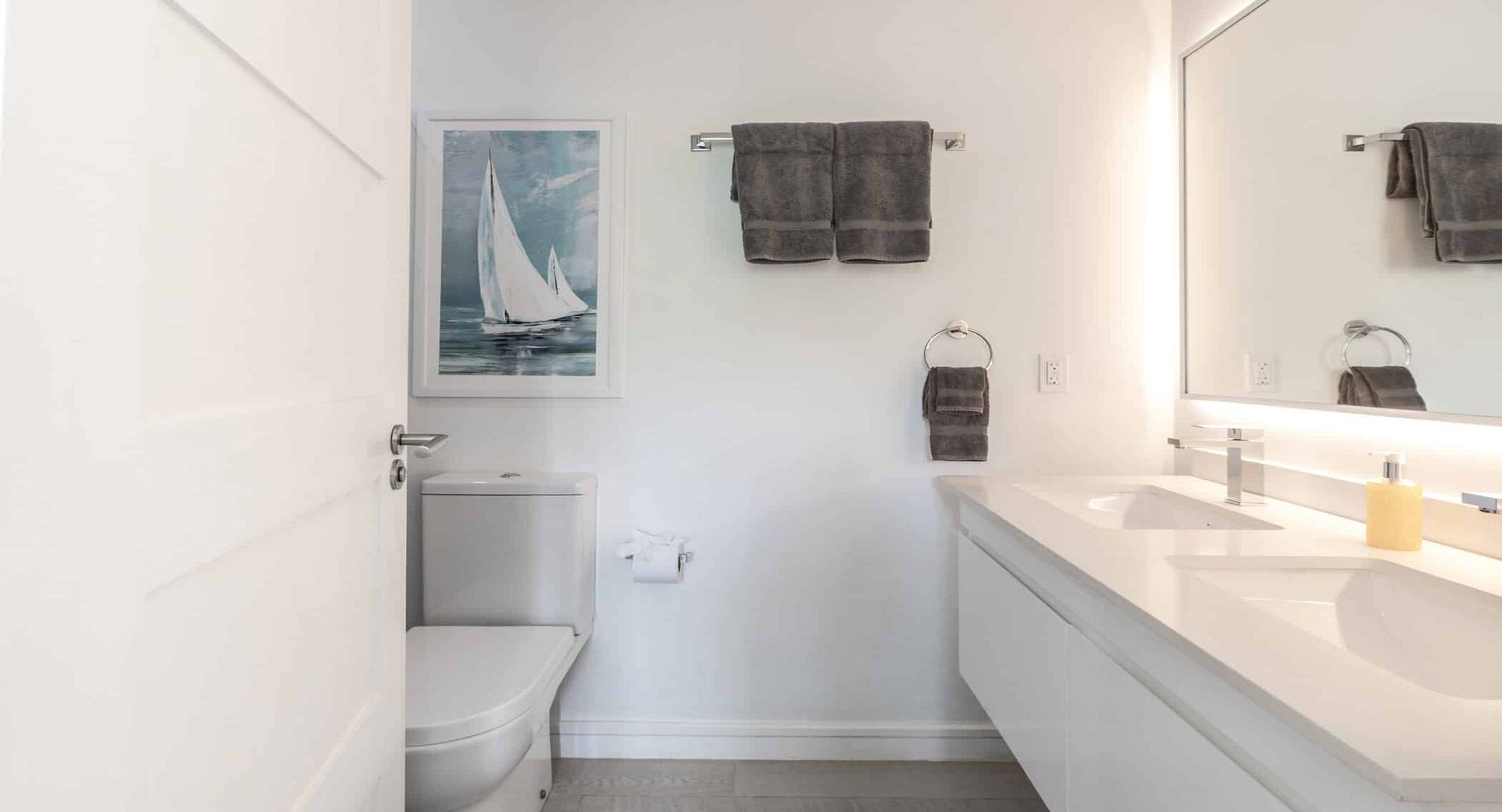 Two additional bedrooms with twin or king bed options, sharing a stylish bathroom with a walk-in shower